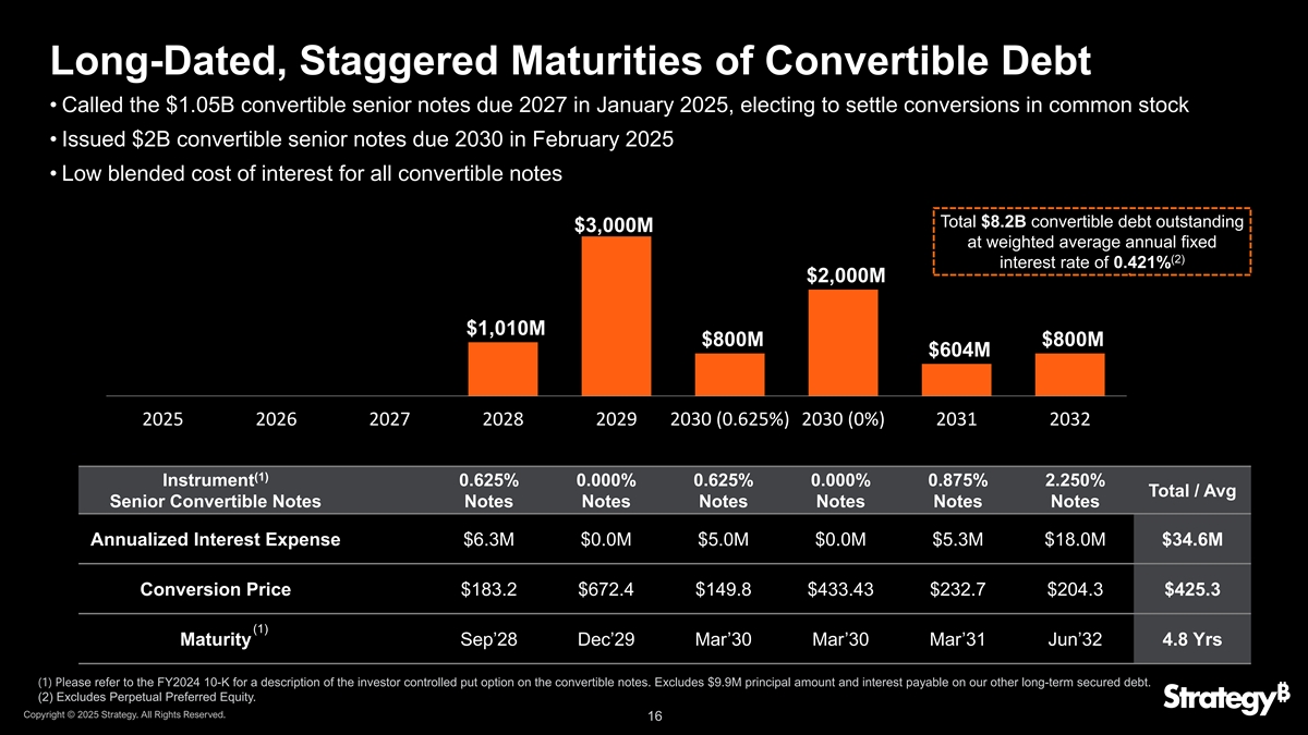 Strategy Capital Structure Strategy的债务和优先证券受到公司比特币储备价值的显着支持,并拥有可观的股权缓冲$ 112B股权盈余比特币盈余(2)备考STRD优先股STRK优先股$ 61B STRF优先股$ 102B转换$ 50B $ 0.25B $ 0.25B $ 1.07B $ 1.07B $ 0.90B $ 0.90B $ 8B $ 8B(1)比特币权益注:截至2025年6月2日提交的8-K。(1)以2025年5月30日收盘股价反映完全摊薄的权益市值。(2)STRD优先股低于STRF优先股和STRK优先股,包括STRF优先股和STRK优先股版权的累积和未支付股息©2025年战略。版权所有。15