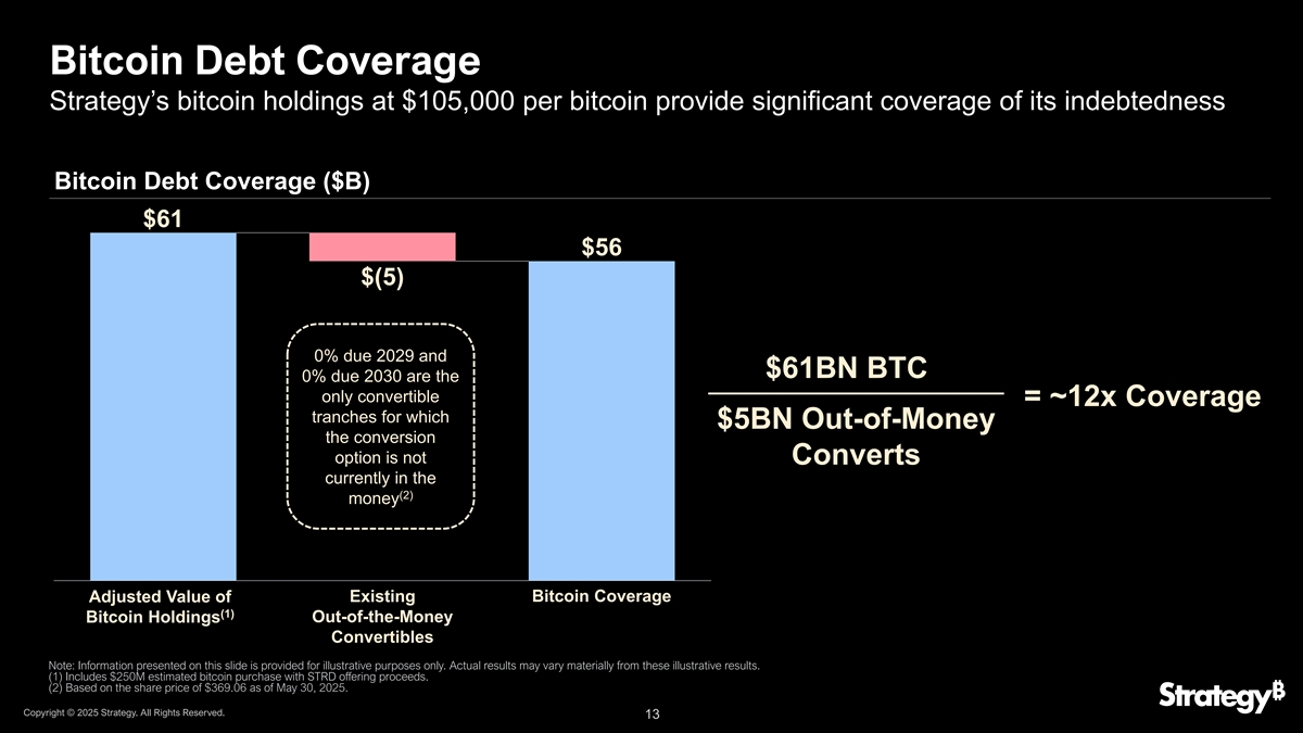 年初至今业绩与2025年目标(BTC KPI)反映了通过策略金库操作产生的增量价值(1)(1)TC收益率% TC $收益(十亿美元)年度目标最低25%年度目标150亿美元15.0 25.0% BTC收益75,826 BTC价格$ 105,000 16.9% $ 8.0目标2025年年初至今2025年目标2025年年初至今2025(1)仅供说明之用。BTC收益率并不等同于传统金融背景下的收益率,BTC $ Gain也不等同于传统金融背景下的“收益”。BTC $ Gain并不代表我们持有的比特币的公允价值收益。年初至今的指标截至2025年6月2日提交的8-K。版权所有©2025年战略。版权所有。12