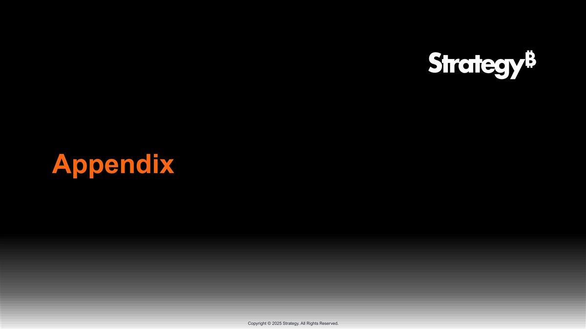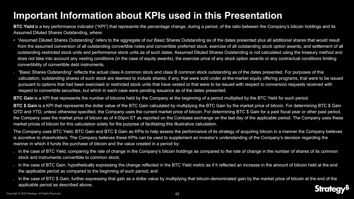 有关本演示文稿中使用的KPI的重要信息BTC收益率是一个关键绩效指标(“KPI”),表示在一段时间内,公司的比特币持有量与其假设稀释的已发行股份之间的比率的百分比变化,其中:•“假设稀释的已发行股份”是指截至演示文稿所示日期,我们的已发行基本股份的总和,加上所有已发行可转换票据和可转换优先股的假设转换、所有已发行股票期权奖励的行使所产生的所有额外股份,以及截至该日期的所有已发行限制性股票单位和业绩股票单位的结算。假定稀释流通在外的股份不使用库藏法计算,也不考虑任何归属条件(在股权奖励的情况下)、任何股票期权奖励的行使价格或任何限制可转换债务工具可兑换性的合同条件。•“已发行基本股份”反映截至呈报日期实际已发行的A类普通股和B类普通股。就此计算而言,此类股票的流通股被视为包括根据市场上股票发行计划出售的、根据已行使的期权或已归属或将就可转换证券收到的转换请求发行的限制性股票单位发行的股票(如果有的话),但在每种情况下,截至所提出的日期,这些股票都在等待发行。BTC增益是一种KPI,表示公司在一段时期开始时持有的比特币数量乘以该时期的BTC收益率。BTC $ Gain是一种KPI,表示BTC增益乘以比特币市场价格计算得出的BTC增益的美元价值。对于确定BTC $ gain QTD和YTD,除非另有说明,公司使用比特币的当前市场价格。为确定上一财年或其他过去期间的BTC $收益,公司使用截至美国东部时间下午4:00的比特币市场价格,该价格在适用期间的最后一天在Coinbase交易所报告。该公司使用比特币的这些市场价格进行这一计算,完全是为了促进这一说明性计算。该公司使用BTC收益率、BTC收益和BTC $收益作为KPI,以帮助评估其以公司认为对股东增值的方式收购比特币的策略的绩效。该公司认为,这些KPI可用于补充投资者对公司关于其为购买比特币提供资金的方式以及在一段时期内创造的价值的决定的理解:•在BTC收益率的情况下,比较公司持有的比特币的变化率与其普通股和可转换为普通股的工具的股份数量变化率;•在BTC收益的情况下,假设表示BTC收益率指标中反映的变化,就好像它反映了在适用期间结束时持有的比特币数量与该期间开始时相比有所增加;•在BTC $ Gain的情况下,进一步将该收益表示为美元价值,方法是将以比特币计价的收益乘以上述适用期间结束时比特币的市场价格。版权所有©2025年战略。版权所有。42