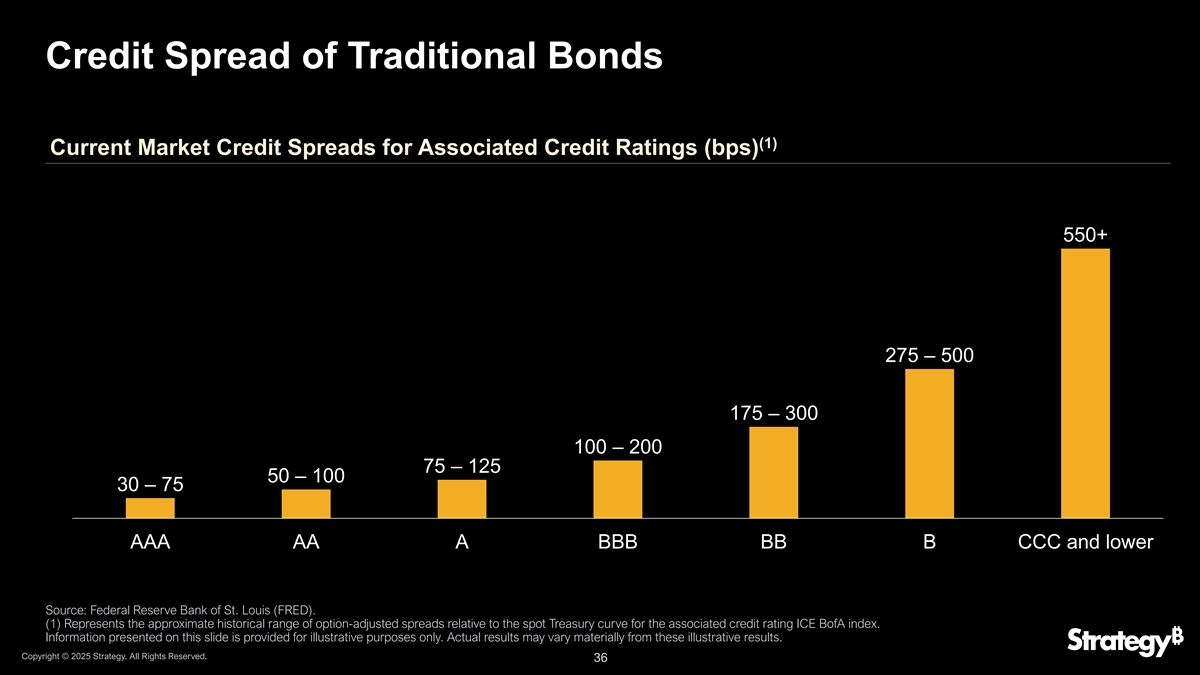 传统债券信用利差(1)当前市场信用利差相关信用评级(bps)550 + 275 – 500175 – 300100 – 20075 – 12550 – 10030 – 75 AAA AA A BBB BB B CCC及更低资料来源:圣路易斯联邦储备银行(FRED)。(1)表示关联信用评级ICE BoFA指数的期权调整价差相对于即期国债曲线的大致历史区间。本幻灯片上提供的信息仅供说明之用。实际结果可能与这些说明性结果大不相同。版权所有©2025年战略。版权所有。36 36
