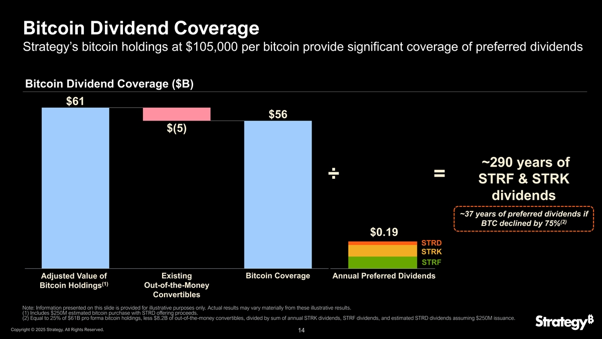 比特币债务覆盖策略的比特币持有量为每比特币105,000美元,为其债务提供了显着的覆盖范围比特币债务覆盖($ B)61美元56美元(5)2029年到期的0%和2030年到期的610亿美元BTC 0%是唯一的可转换=~12倍覆盖部分,其中50亿美元的价外转换期权目前未在Bitcoi Bitcoi n Holdin Holdings gs价外可转换债券现有(1)(1)的(2)货币比特币覆盖范围Adjus Pro Forma ted val val ue ue注:本幻灯片上提供的信息仅用于说明目的。实际结果可能与这些说明性结果大不相同。(1)包括以STRD发行收益估计的2.5亿美元比特币购买。(2)基于截至2025年5月30日的股价369.06美元。版权所有©2025年战略。版权所有。13