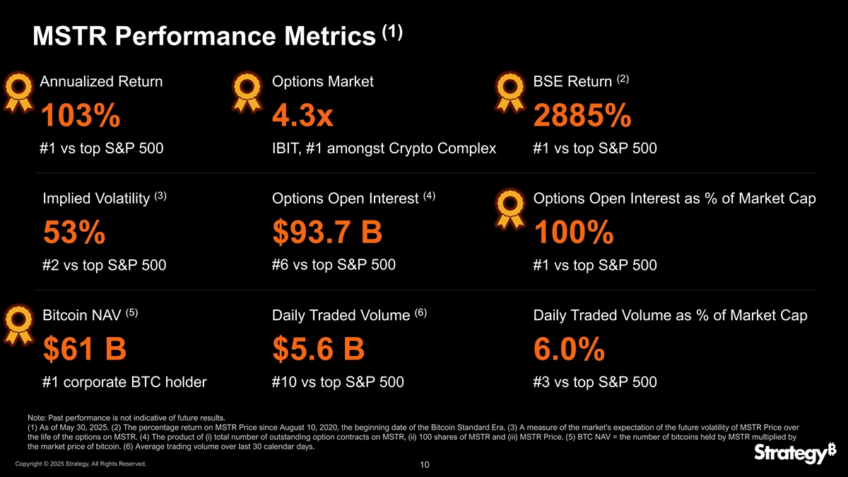 (1)MSTR绩效指标(2)年化回报期权市场疯牛病回报率103% 4.3x 2885% # 1 vs top 标普 500IBIT,# 1 among Crypto Complex # 1 vs top 标普 500(3)(4)隐含波动率期权未平仓合约占市值百分比53% $ 93.7 b 100% # 6 vs top 标普 500 # 2 vs top 标普 500 # 1 vs top 标普 500(5)(6)比特币NAV每日交易量每日交易量占市值百分比$ 61b $ 5.6 b 6.0% # 1 corporate BTC holder # 10 vs top 标普 500 # 3 vs top 标普 500注:过去的表现并不代表未来的结果。(1)截至2025年5月30日止。(2)自2020年8月10日,即比特币标准时代的起始日以来,MSTR价格的收益率百分比。(3)衡量市场对MSTR上期权整个存续期内MSTR价格未来波动率的预期。(4)(i)MSTR上未行使的期权合约总数,(ii)100份MSTR与(iii)MSTR价格的乘积。(5)BTC NAV = MSTR持有的比特币数量乘以比特币的市场价格。(6)过去30个日历日的平均交易量。版权所有©2025年战略。版权所有。10