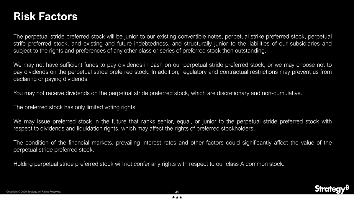 风险因素永续大步优先股将低于我们现有的可转换票据、永续行使权优先股、永续冲突优先股以及现有和未来的债务,并且在结构上低于我们子公司的负债,并受制于当时已发行的任何其他类别或系列优先股的权利和优先权。我们可能没有足够的资金以现金支付我们的永续大步优先股的股息,或者我们可能选择不支付永续大步优先股的股息。此外,监管和合同限制可能会阻止我们宣布或支付股息。您可能不会收到永久大步优先股的股息,这是可自由支配的和非累积的。优先股只有有限的投票权。我们可能会在未来发行优先股,在股息和清算权方面排名高于、等于或低于永续大步优先股,这可能会影响优先股股东的权利。金融市场状况、现行利率等因素可能显著影响永续跨式优先股的价值。持有永久跨步优先股不会授予我们A类普通股的任何权利。版权所有©2025年战略。版权所有。49***