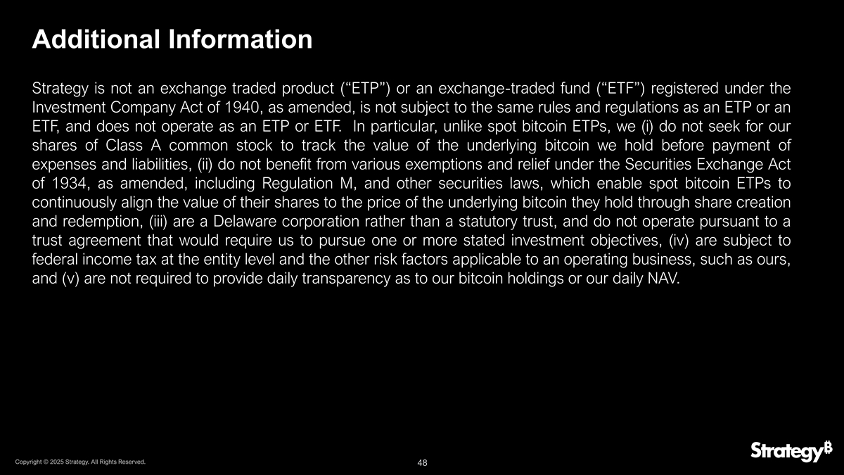 附加信息Strategy不是根据经修订的1940年《投资公司法》注册的交易所交易产品(“ETP”)或交易所交易基金(“ETF”),不受与ETP或ETF相同的规则和规定的约束,也不作为ETP或ETF运作。特别是,与现货比特币ETP不同,我们(i)不寻求让我们的A类普通股股票追踪我们在支付费用和负债之前持有的基础比特币的价值,(ii)不受益于经修订的1934年证券交易法(包括M条例)和其他证券法规定的各种豁免和救济,这些法律使现货比特币ETP能够通过股票创建和赎回不断使其股票价值与其持有的基础比特币的价格保持一致,(iii)是一家特拉华州公司而不是法定信托,并且不根据要求我们追求一个或多个既定投资目标的信托协议进行运营,(iv)须在实体层面缴纳联邦所得税以及适用于运营业务的其他风险因素,例如我们的业务,以及(v)不需要就我们的比特币持有量或每日资产净值提供每日透明度。版权所有©2025年战略。版权所有。48