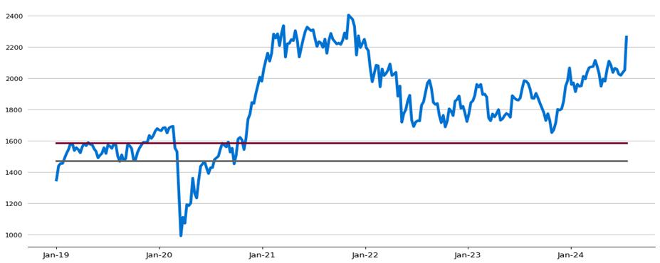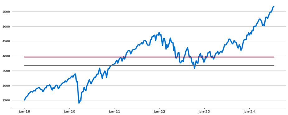 下图列出了SPX在2019年1月2日至2024年7月16日期间的每日历史表现。我们从Bloomberg L.P.获得了这一历史数据。我们未对从Bloomberg L.P.获得的信息的准确性或完整性进行独立验证。图中的水平深红线代表SPX假设的票息障碍3967.04,是SPX假设的初始值5667.20的70%,这是其在2024年7月16日的收盘水平。图中的水平灰线代表SPX的假设下行阈值3683.68,是SPX假设初始值的65%。实际初始值、票息障碍和下行阈值将在交易日期确定。