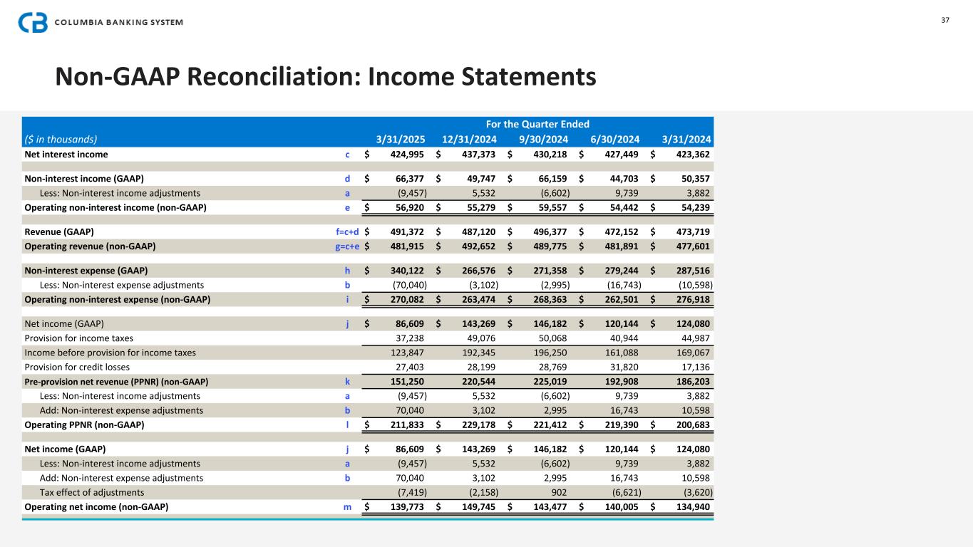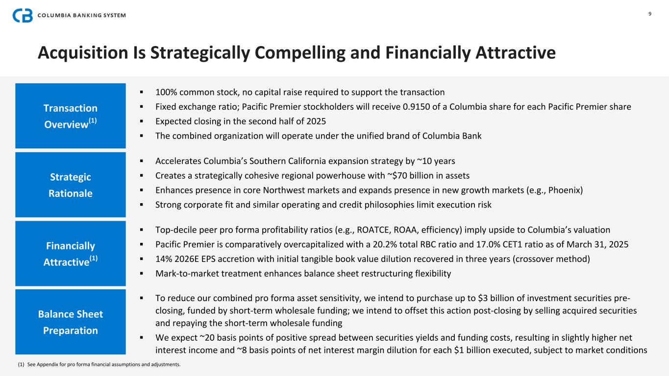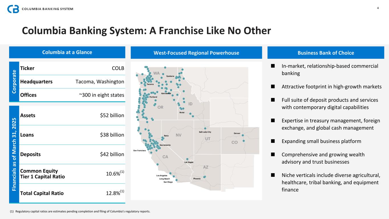 免责声明(续)与拟议交易有关的重要附加信息以及在哪里可以找到这些信息,Columbia将向SEC提交表格S-4的注册声明,其中将包括Columbia和Pacific Premier的联合代理声明和Columbia的招股说明书,以及与交易有关的其他相关文件。涉及Columbia和Pacific Premier的交易的某些事项将提交给Columbia和Pacific Premier的股东或股东(如适用),供其考虑。在根据任何此类司法管辖区的证券法进行注册或获得资格之前此类要约、招揽或出售将是非法的任何司法管辖区,本通讯不构成出售要约或购买任何证券的要约招揽或任何投票或批准的招揽,也不构成任何证券出售。投资者、哥伦比亚股东和太平洋地区的主要股东被敦促在可获得时阅读登记声明和关于交易的联合代理声明/招股说明书,以及就交易向SEC提交的任何其他相关文件,以及对这些文件的任何修订或补充,因为它们将包含重要信息股东或股东(如适用)将能够在SEC网站www.sec.gov上免费获得最终联合委托书/招股说明书的副本,以及包含有关此次交易、Columbia和Pacific Premier信息的其他文件。联合委托书/招股说明书的副本以及将以引用方式并入联合委托书/招股说明书的向SEC提交的文件的副本,也可以免费获得,方法是向Columbia Banking System, Inc.提出请求,收件人:Investor Relations,1301 A Street,Tacoma,WA 98402-4200,(503)727-4100或向Pacific Premier Bancorp, Inc.,收件人:Corporate Secretary,17901 Von Karman Avenue,Suite 1200,Irvine,加利福尼亚州 92614,(949)864-8000。根据SEC的规则,参与征集的哥伦比亚公司、Pacific Premier及其各自的某些董事和执行官可能会被视为参与向哥伦比亚公司股东或Pacific Premier股东征集与交易有关的代理。有关哥伦比亚公司董事和执行官的信息,可在哥伦比亚公司截至2024年12月31日的财政年度10-K表格年度报告中题为“董事、执行官和公司治理”和“某些受益所有人和管理层的证券所有权及相关股东事项”的章节中查阅,该报告于2025年2月25日提交给SEC(可在此处查阅);在题为“董事会Structure和薪酬”、“薪酬讨论与分析”、“薪酬表”、“有关高管的信息”等部分Columbia于2025年4月3日向SEC提交的与2025年年度股东大会有关的最终代理声明中的“董事和执行官的实益所有权”和“某些关系和关联交易”(可在此处查阅);以及Columbia向SEC提交的其他文件。有关Pacific Premier的董事和执行官的信息,可在Pacific Premier截至2024年12月31日的财政年度的10-K表格年度报告中标题为“董事、执行官和公司治理”和“某些实益拥有人和管理层的证券所有权和相关股东事项”的章节中查阅,于2025年2月28日向SEC提交(可在此处查阅);在题为“非雇员董事的薪酬”、“董事和执行官的安全所有权”、“某些关系和相关交易”、“薪酬汇总表”、“雇佣协议、薪酬延续计划、遣散费和控制权变更付款”的章节中,以及Pacific Premier于2025年4月7日向SEC提交的与其2025年年度股东大会相关的最终代理声明中的“潜在终止付款摘要”(可在此处获取);以及Pacific Premier向SEC提交的其他文件。如果Columbia的董事和执行官持有的Columbia普通股或Pacific Premier的董事和执行官持有的Pacific Premier普通股与上述文件中反映的这些人持有的金额发生变化,此类变更已经或将反映在向SEC提交的表格4上的所有权变更声明中。有关代理征集参与者的其他信息以及对其直接和间接利益的描述,通过证券持有或其他方式, 将载于有关该交易的联合代理声明/招股章程。本文件可按前款规定免费领取。非公认会计准则财务指标除了按照公认会计准则列报的结果外,本演示文稿还包含某些非公认会计准则财务指标。GAAP与非GAAP措施的对账包含在附录中。该公司认为,提供某些非公认会计准则财务指标可为投资者提供有用的信息,以了解我们的财务业绩、我们的业绩趋势以及我们的财务状况。我们将这些措施用于内部规划和预测目的,运营拨备前净收入和有形普通股的运营回报率也被用作我们对执行官的激励薪酬计划的一部分。我们,以及证券分析师、投资者、其他利益相关方,也用这些衡量标准来比较同行公司的经营业绩。我们相信,我们的介绍和讨论,连同伴随的对账,提供了对影响我们业务的因素和趋势的完整理解,并允许投资者以类似于管理层的方式看待业绩。这些非GAAP衡量标准不应被视为替代GAAP基础衡量标准和结果,我们强烈鼓励投资者全面审查我们的合并财务报表,不要依赖任何单一的财务衡量标准。由于非美国通用会计准则财务指标不标准化,可能无法将这些财务指标与名称相同或相似的其他公司的非美国通用会计准则财务指标进行比较。3