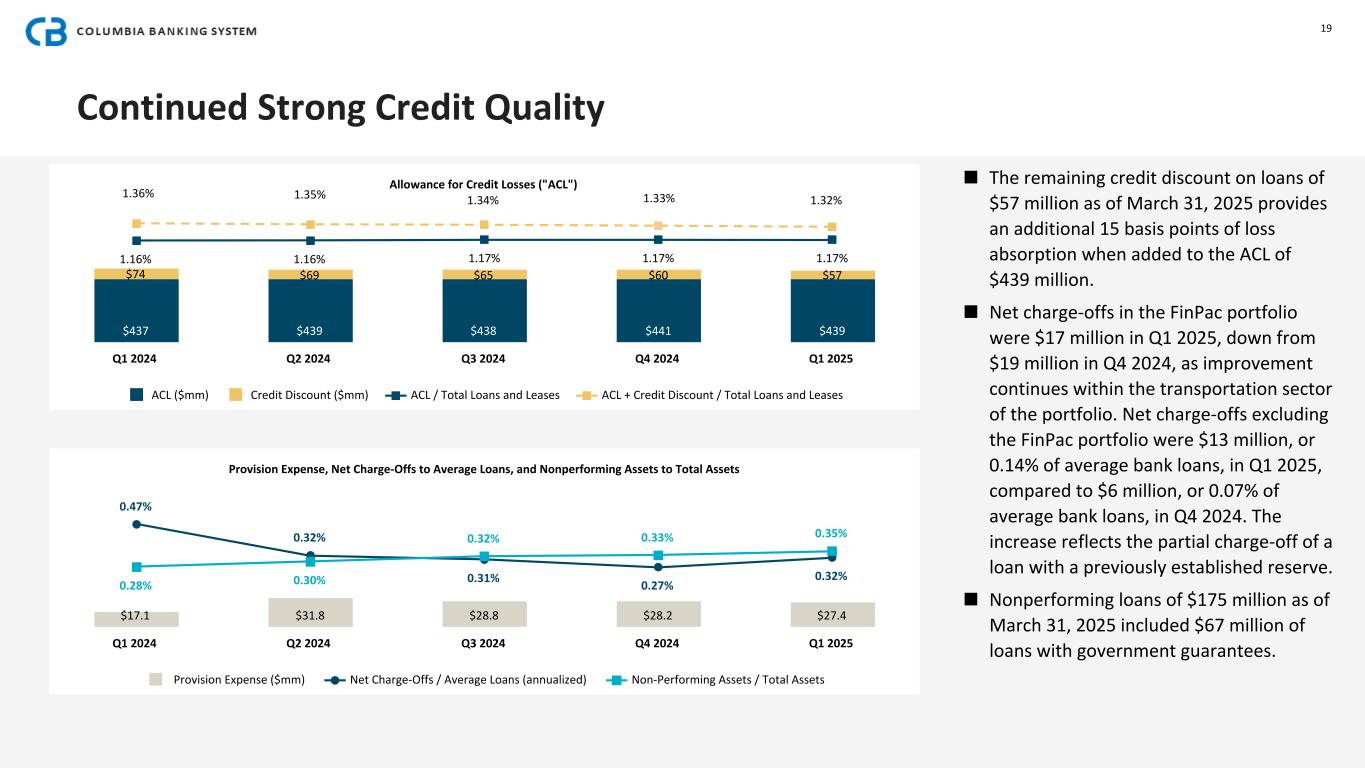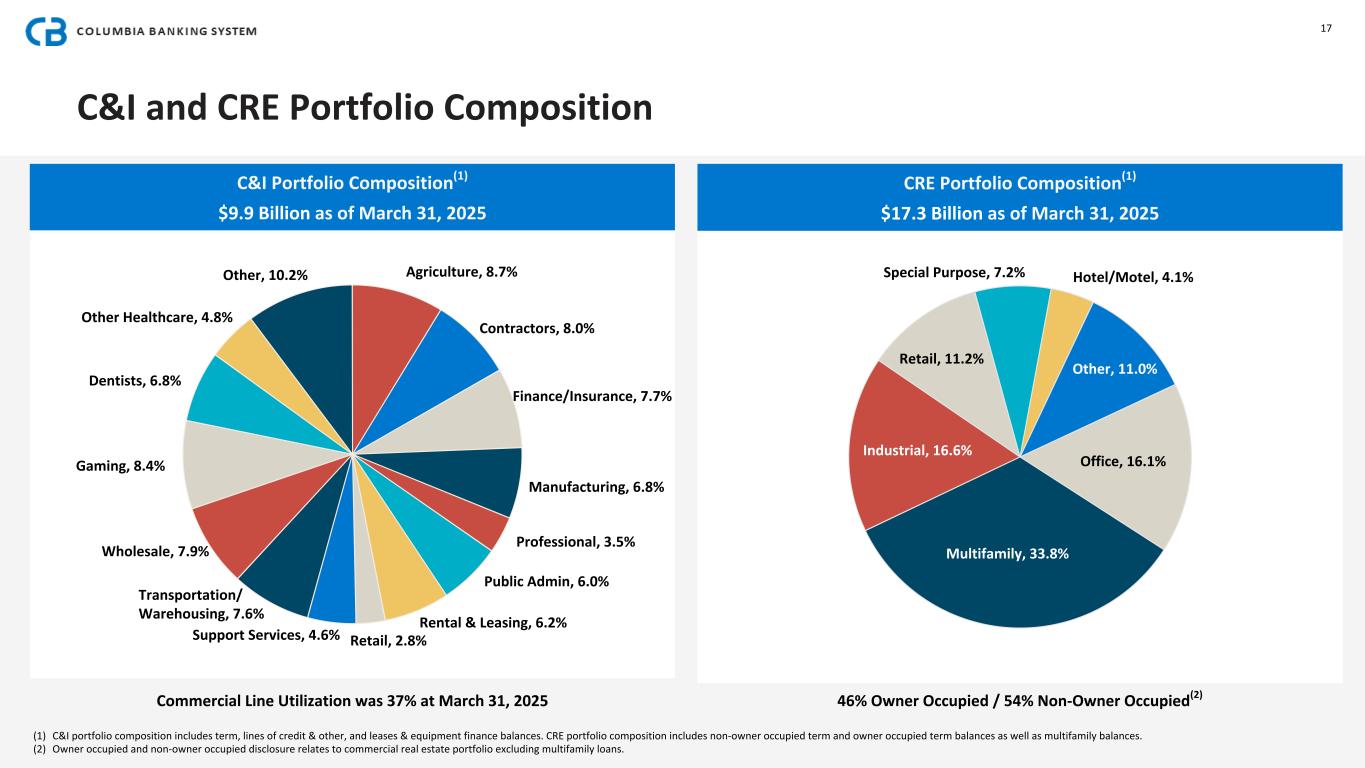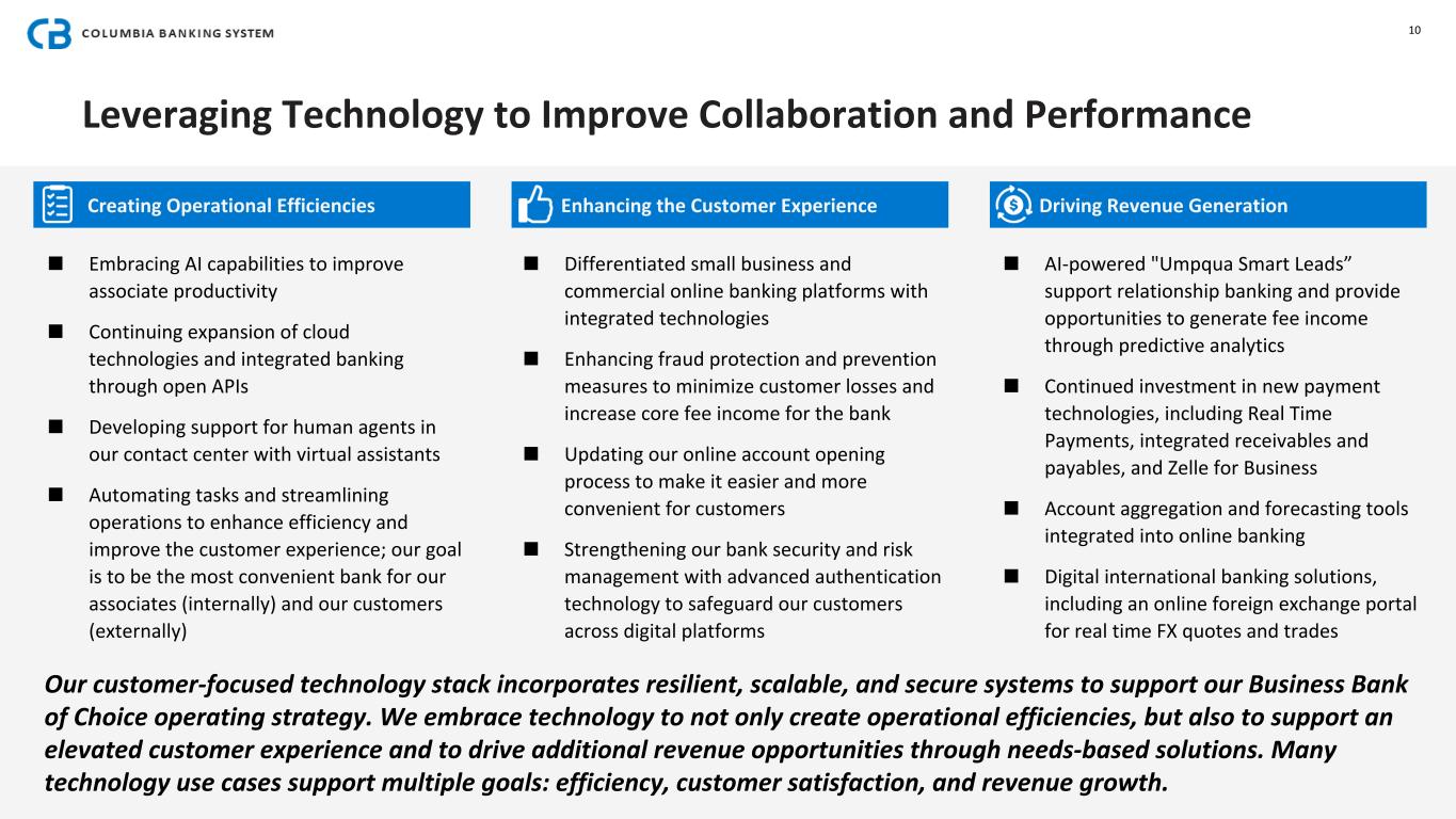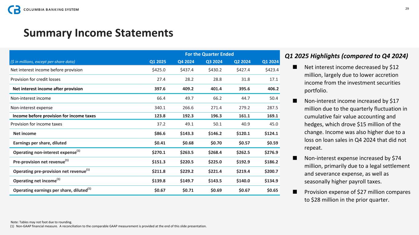 免责声明(续)与拟议交易有关的重要附加信息以及在哪里可以找到这些信息,Columbia将向SEC提交表格S-4的注册声明,其中将包括Columbia和Pacific Premier的联合代理声明和Columbia的招股说明书,以及与交易有关的其他相关文件。涉及Columbia和Pacific Premier的交易的某些事项将提交给Columbia和Pacific Premier的股东或股东(如适用),供其考虑。在根据任何此类司法管辖区的证券法进行注册或获得资格之前此类要约、招揽或出售将是非法的任何司法管辖区,本通讯不构成出售要约或购买任何证券的要约招揽或任何投票或批准的招揽,也不构成任何证券出售。投资者、哥伦比亚股东和太平洋地区的主要股东被敦促在可获得时阅读登记声明和关于交易的联合代理声明/招股说明书,以及就交易向SEC提交的任何其他相关文件,以及对这些文件的任何修订或补充,因为它们将包含重要信息股东或股东(如适用)将能够在SEC网站www.sec.gov上免费获得最终联合委托书/招股说明书的副本,以及包含有关此次交易、Columbia和Pacific Premier信息的其他文件。联合委托书/招股说明书的副本以及将以引用方式并入联合委托书/招股说明书的向SEC提交的文件的副本,也可以免费获得,方法是向Columbia Banking System, Inc.提出请求,收件人:Investor Relations,1301 A Street,Tacoma,WA 98402-4200,(503)727-4100或向Pacific Premier Bancorp, Inc.,收件人:Corporate Secretary,17901 Von Karman Avenue,Suite 1200,Irvine,加利福尼亚州 92614,(949)864-8000。根据SEC的规则,参与征集的哥伦比亚公司、Pacific Premier及其各自的某些董事和执行官可能会被视为参与向哥伦比亚公司股东或Pacific Premier股东征集与交易有关的代理。有关哥伦比亚公司董事和执行官的信息,可在哥伦比亚公司截至2024年12月31日的财政年度10-K表格年度报告中题为“董事、执行官和公司治理”和“某些受益所有人和管理层的证券所有权及相关股东事项”的章节中查阅,该报告于2025年2月25日提交给SEC(可在此处查阅);在题为“董事会Structure和薪酬”、“薪酬讨论与分析”、“薪酬表”、“有关高管的信息”等部分Columbia于2025年4月3日向SEC提交的与2025年年度股东大会有关的最终代理声明中的“董事和执行官的实益所有权”和“某些关系和关联交易”(可在此处查阅);以及Columbia向SEC提交的其他文件。有关Pacific Premier的董事和执行官的信息,可在Pacific Premier截至2024年12月31日的财政年度的10-K表格年度报告中标题为“董事、执行官和公司治理”和“某些实益拥有人和管理层的证券所有权和相关股东事项”的章节中查阅,于2025年2月28日向SEC提交(可在此处查阅);在题为“非雇员董事的薪酬”、“董事和执行官的安全所有权”、“某些关系和相关交易”、“薪酬汇总表”、“雇佣协议、薪酬延续计划、遣散费和控制权变更付款”的章节中,以及Pacific Premier于2025年4月7日向SEC提交的与其2025年年度股东大会相关的最终代理声明中的“潜在终止付款摘要”(可在此处获取);以及Pacific Premier向SEC提交的其他文件。如果Columbia的董事和执行官持有的Columbia普通股或Pacific Premier的董事和执行官持有的Pacific Premier普通股与上述文件中反映的这些人持有的金额发生变化,此类变更已经或将反映在向SEC提交的表格4上的所有权变更声明中。有关代理征集参与者的其他信息以及对其直接和间接利益的描述,通过证券持有或其他方式, 将载于有关该交易的联合代理声明/招股章程。本文件可按前款规定免费领取。非公认会计准则财务指标除了按照公认会计准则列报的结果外,本演示文稿还包含某些非公认会计准则财务指标。GAAP与非GAAP措施的对账包含在附录中。该公司认为,提供某些非公认会计准则财务指标可为投资者提供有用的信息,以了解我们的财务业绩、我们的业绩趋势以及我们的财务状况。我们将这些措施用于内部规划和预测目的,运营拨备前净收入和有形普通股的运营回报率也被用作我们对执行官的激励薪酬计划的一部分。我们,以及证券分析师、投资者、其他利益相关方,也用这些衡量标准来比较同行公司的经营业绩。我们相信,我们的介绍和讨论,连同伴随的对账,提供了对影响我们业务的因素和趋势的完整理解,并允许投资者以类似于管理层的方式看待业绩。这些非GAAP衡量标准不应被视为替代GAAP基础衡量标准和结果,我们强烈鼓励投资者全面审查我们的合并财务报表,不要依赖任何单一的财务衡量标准。由于非美国通用会计准则财务指标不标准化,可能无法将这些财务指标与名称相同或相似的其他公司的非美国通用会计准则财务指标进行比较。3