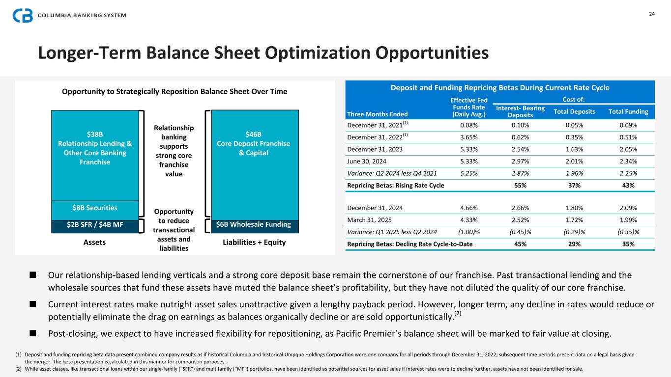 长期资产负债表优化机会24 ■我们基于关系的贷款垂直领域和强大的核心存款基础仍然是我们特许经营的基石。过去的交易贷款和为这些资产提供资金的批发来源降低了资产负债表的盈利能力,但它们并没有稀释我们核心特许经营权的质量。■鉴于回收期较长,目前的利率使得直接出售资产没有吸引力。然而,更长期来看,随着余额有机下降或被机会性出售,利率的任何下降都将减少或潜在地消除对盈利的拖累。(2)■交易结束后,我们预计重新定位的灵活性将增加,因为Pacific Premier的资产负债表将在交易结束时标记为公允价值。有机会随着时间的推移对资产负债表进行战略性重新定位资产负债+股权$ 6B批发融资$ 2B SFR/$ 4B MF $ 8B证券$ 38B关系借贷和其他核心银行业务特许经营权$ 46B核心存款特许经营权和资本机会,以减少交易资产和负债关系银行业务支持强大的核心特许经营价值(1)存款和资金重新定价贝塔数据呈现合并后的公司业绩,就好像历史哥伦比亚公司和历史Umpqua Holdings Corporation在截至2022年12月31日的所有期间都是一家公司一样;随后的时间段在考虑到合并的情况下,在法律基础上呈现数据。为了比较目的,以这种方式计算beta演示文稿。(2)虽然资产类别,如我们单户家庭(“SFR”)和多户家庭(“MF”)投资组合中的交易贷款,已被确定为如果利率进一步下降,资产出售的潜在来源,但尚未确定资产出售。当前利率周期期间存款和资金重定价贝塔有效联邦基金利率(日均)成本:三个月期末计息存款总存款总资金2021年12月31日(1)0.08% 0.10% 0.05% 0.09% 2022年12月31日(1)3.65% 0.62% 0.35% 0.51% 2023年12月31日5.33% 2.54% 1.63% 2.05% 2024年6月30日5.33% 2.97% 2.01% 2.34%方差:2024年Q2减2021年Q4 5.25% 2.87% 1.96% 2.25%重定价贝塔:利率周期上升55% 37% 43% 2024年12月31日4.66% 2.66% 1.80% 2.09% 3月31日,20254.33% 2.52% 1.72% 1.99%方差:Q1 2025减Q2 2024(1.00)%(0.45)%(0.29)%(0.35)%重定价贝塔:退库率周期至今45% 29% 35%