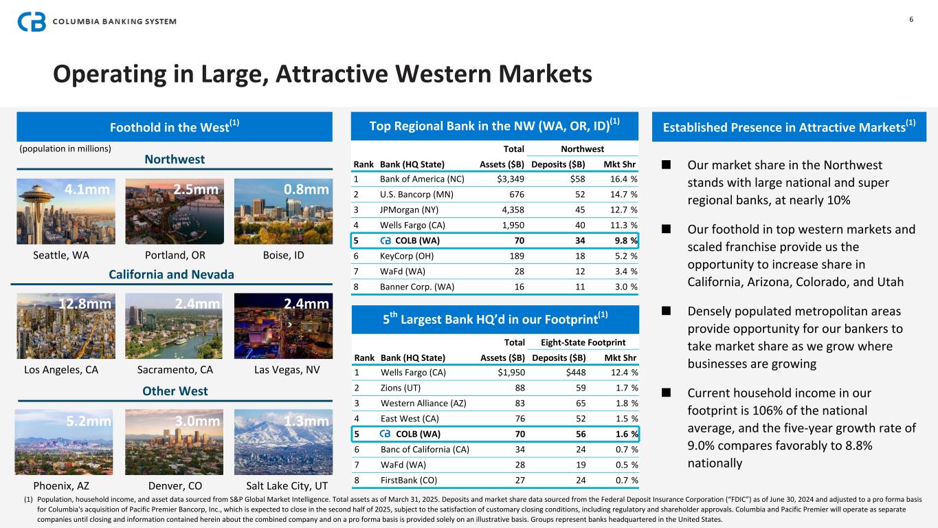 在大型、有吸引力的西部市场经营6个据点在西部(1)西北部(百万人口)华盛顿州波特兰的西雅图,或加利福尼亚州和内华达州的洛杉矶、加利福尼亚州萨克拉门托、加利福尼亚州其他西凤凰城、亚利桑那州丹佛市、CO 4.1mm 2.5mm 12.8mm 2.4mm 5.2mm 3.0mm在西北部地区银行(华盛顿州,或,ID)(1)Total Northwest Rank Bank(HQ State)Assets($ B)Deposits($ B)MKT SHR 1 Bank of America(NC)$ 3,349 $ 58 16.4% 2 美国合众银行(MN)6765214.7% 3 JPMorgan(NY)4,3584512.7% 4 富国银行(加利福尼亚州)1,9504011.3% 5 COLB(WA)70349.8% 6 KeyCorp(OH)189185.2% 7 WaFd(WA)28123.4% 8 邦纳 Corp.(WA)16113.0% 5th Largest Bank HQ'd in our footprint(1)Total Eight-State Footprint Rank Bank(HQ State)Assets($ B)Deposits($ B)MKG12.4% 2 Zions(UT)88591.7% 3 Western Alliance(AZ)83651.8% 4 East West(加利福尼亚州)765 21.5% 5 COLB(WA)70561.6% 6 加州银行(加利福尼亚州)34240.7% 7 WaFd(WA)28190.5% 8 FirstBank(CO)27240.7%在有吸引力的市场建立了存在(1)■我们在西北地区的市场份额与大型全国性和超级区域性银行并驾齐驱,接近10% ■我们在顶级西部市场的立足点和规模化的特许经营权为我们提供了在加利福尼亚州、亚利桑那州增加份额的机会,科罗拉多州和犹他州■人口稠密的大都市区为我们的银行家提供了机会,让他们在我们业务增长的地方获得市场份额■目前我们足迹中的家庭收入是全国平均水平的106%,9.0%的五年增长率优于全国的8.8%,美国犹他州盐湖城的博伊西,内华达州0.8mm 2.4mm 1.3mm(1)人口、家庭收入和资产数据来自标普全球市场情报。截至2025年3月31日资产总额。截至2024年6月30日,存款和市场份额数据来自美国联邦存款保险公司(“FDIC”),并已调整为哥伦比亚公司收购Pacific Premier Bancorp, Inc.的备考基础,该收购预计将于2025年下半年完成,但需满足惯例成交条件,包括监管机构和股东的批准。Columbia和Pacific Premier将作为独立的公司运营,直到交易结束,此处包含的有关合并后公司和备考基础上的信息仅在说明性基础上提供。集团代表总部设在美国的银行。