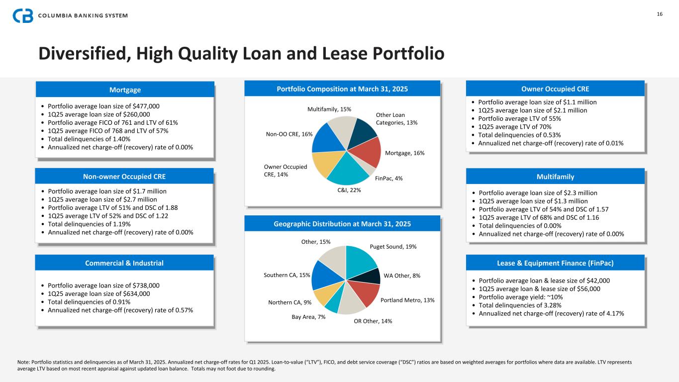 多元化、高质量的贷款和租赁组合注:截至2025年3月31日的组合统计和拖欠情况。2025年第一季度的年化净冲销率。贷款与价值(“LTV”)、FICO和偿债覆盖率(“DSC”)比率基于可获得数据的投资组合的加权平均值。LTV代表基于最新评估的平均LTV与更新的贷款余额。由于四舍五入,总数可能不够。•投资组合平均贷款规模为477,000美元• 25年第一季度平均贷款规模为260,000美元•投资组合平均FICO为761,LTV为61% • 25年第一季度平均FICO为768,LTV为57% •总拖欠率为1.40% •年化净冲销(回收)率为0.00非业主占用CRE •投资组合平均贷款规模为170万美元• 25年第一季度平均贷款规模为270万美元•投资组合平均LTV为51%,DSC为1.88 • 25年第一季度平均LTV为52%和DSC为1.22 •总拖欠率为1.19% •年化净冲销(回收)率为0.000%商业和工业•投资组合平均贷款规模为738000美元• 25年第一季度平均贷款规模为634000美元•总拖欠率为0.91% •年化净冲销(回收)率为0.57%多户家庭•投资组合平均贷款规模为230万美元• 25年第一季度平均贷款规模为130万美元•投资组合平均LTV为54%,DSC为1.57 • 25年第一季度平均LTV为68%和DSC为1.16 •总拖欠率为0.00 %•年化净冲销(回收)率为0.00业主占用CRE •投资组合平均贷款规模为110万美元• 25年第一季度平均贷款规模为210万美元•投资组合平均LTV为55% • 25年第一季度平均LTV为70% •总拖欠率为0.53% •年化净冲销(回收)率为0.01%租赁和设备融资(FinPAC)•投资组合平均贷款和租赁规模为42,000美元• 25年第一季度平均贷款和租赁规模为56,000美元•投资组合平均收益率:~10% •总拖欠率为3.28% •年化净冲销(回收)率4.17%普吉特海湾、19%西澳其他、8%波特兰地铁、13%或其他、14%湾区、7%北部加利福尼亚州、9%南部加利福尼亚州、15%其他、15%抵押贷款、16% FinPAC、4% C & I、22%业主自住CRE、14%非OO CRE、16%多户家庭、15%其他贷款类别、13%截至2025年3月31日的投资组合构成2025年3月31日的地理分布抵押贷款16