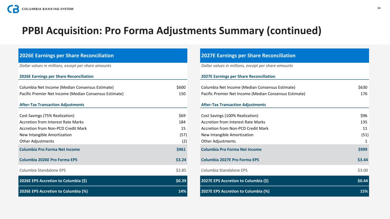 PPBI收购:备考调整摘要33(1)正数对权益有利;负数对权益不利。每股有形账面价值调节美元价值百万,每股金额除外Columbia有形每股账面价值收盘时19.14美元Columbia普通股收盘时5430美元交易价值2033 Pacific Premier未摊销次级债发行费用(2)交易费用(146)收盘时的备考普通股7315 Columbia无形资产收盘时1408商誉产生177 CDI收盘时产生416备考无形资产2001CECL Reserve对收购贷款的净影响(36)备考有形普通股收盘时5,278美元已发行哥伦比亚普通股收盘时210,112,415股已发行给Pacific Premier股东88,368,619股已发行备考普通股298,481,034股备考有形每股账面价值17.68美元商誉和解美元价值数百万,每股金额除外交易价值2,033美元Pacific Premier普通股收盘时2,970美元现有无形资产(924)与无形资产相关的DTL 6购买会计调整(1)HTM投资证券(327美元)贷款总额(544)贷款损失准备金转回168获得的贷款标记转回25固定资产12总购买会计调整:资产(666)递延所得税资产/(负债)166定期存款(11)总购买会计调整:负债(11)递延所得税资产/(负债)3 Pacific Premier收盘时调整有形权益1,544美元隐含溢价489美元溢价分配核心存款无形416美元递延所得税资产/(负债)(104)净CDI分配312美元商誉分配177美元