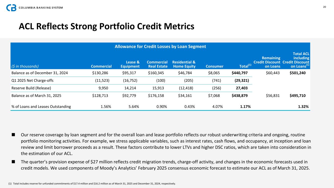 ACL反映了强劲的投资组合信用指标(1)总额包括截至2025年3月31日和2024年12月31日分别为1740万美元和1620万美元的无资金承诺准备金。20 ■我们按贷款分部以及对整体贷款和租赁组合的准备金覆盖率反映了我们稳健的承销标准和持续的、例行的投资组合监测活动。例如,我们在开始和贷款审查时强调适用的变量,例如利率、现金流和占用,并因此限制借款人的收益。这些因素导致较低的LTV和较高的DSC比率,这在我们的ACL估计中被考虑在内。■本季度2700万美元的拨备费用反映了信贷迁移趋势、冲销活动以及信贷模型中使用的经济预测的变化。我们使用了Moody’s Analytics的2025年2月一致经济预测的组成部分来估计我们截至2025年3月31日的ACL。按贷款分部划分的信贷损失准备金(单位:千美元)商业租赁和设备商业房地产住宅和房屋净值消费者总额(1)贷款剩余信贷折扣总额ACL,包括贷款信贷折扣(1)截至2024年12月31日的余额130,286美元95,317美元160,345美元46,784美元8,065美元440,797美元60,443美元501,240美元2025年第一季度净冲销(11,523)(16,752)(100)(205)(741)(29,321)准备金建立(释放)9,95014,21415,913(12,418)(256)27,403截至2025年3月31日的余额128,713美元92,779美元176,158美元34,161美元7,068美元438,879美元56,831美元495,
