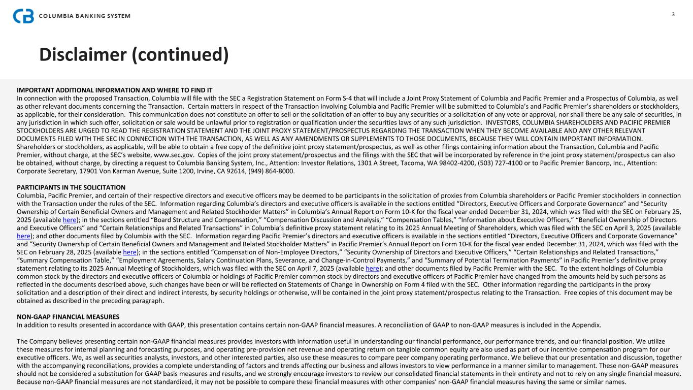 免责声明前瞻性陈述本通讯可能包含某些前瞻性陈述,包括但不限于某些计划、期望、目标、预测,以及有关Columbia Banking System, Inc.(“Columbia”)和Pacific Premier Bancorp, Inc.(“Pacific Premier Bancorp,Inc.”)之间拟议业务合并交易(“交易”)的利益的陈述,Columbia和Pacific Premier的计划、目标、期望和意图,交易完成的预期时间,以及其他非历史事实的陈述。此类陈述受到众多假设、风险和不确定性的影响。除历史事实陈述之外的所有陈述,包括关于信念和期望的陈述,都是前瞻性陈述。前瞻性陈述可以通过诸如“预期”、“预期”、“相信”、“打算”、“估计”、“计划”、“相信”、“目标”、“目标”或类似表达方式,或未来或条件动词,如“将”、“可能”、“可能”、“应该”、“将”、“可能”或类似变体来识别。这些前瞻性陈述旨在遵守1933年《证券法》第27A条、1934年《证券交易法》第21E条和1995年《私人证券诉讼改革法》提供的安全港。尽管无法保证任何风险和不确定性或风险因素清单是完整的,但以下是可能导致实际结果与前瞻性陈述或历史业绩中包含或暗示的结果存在重大差异的某些因素:总体经济、政治或行业状况的变化,以及具体影响银行业的情况;美国财政、货币和贸易政策的不确定性,包括联邦储备委员会的利率政策或住房和商业房地产价格下跌的影响、高失业率或不断增加的失业率、持续或重新出现的通胀,美国政府提议或征收的关税或美国贸易伙伴提议或征收的报复性关税的影响,可能对客户产生不利影响或经济增长出现任何衰退或放缓,特别是在美国西部;全球资本和信贷市场的波动和中断;银行倒闭或其他银行的不利发展对投资者关于银行稳定性和流动性的普遍情绪的影响;可能显着降低净利息收入并对资产收益率、估值和资金来源产生负面影响的利率变化,包括对提前还款速度的影响;金融机构和非传统金融服务提供商之间的竞争压力,包括对产品定价和服务的压力;哥伦比亚或太平洋总理的贷款组合(包括商业房地产贷款)、对某些借款人的大额贷款以及某些客户的大额存款的集中度;哥伦比亚和太平洋总理各自业务战略的成功、影响和时机,包括任何新产品或服务的市场接受度以及哥伦比亚和太平洋总理成功实施效率和卓越运营举措的能力;政府行动、审查、审查、改革、法规的性质、程度、时机和结果,和解释;法律法规的变化;任何事件的发生,可能导致一方或双方有权终止Columbia和Pacific Premier作为当事方的合并协议的变更或其他情况;可能对Columbia或Pacific Premier提起的任何法律诉讼的结果;延迟完成交易;未能获得必要的监管批准(以及此类批准可能导致施加可能对合并后公司或交易的预期收益产生不利影响的条件的风险);未能获得股东或股东批准(如适用),或及时或完全满足交易完成的任何其他条件;Columbia或Pacific Premier在收盘前的股价变化,包括由于收盘前另一方的财务表现,或更普遍地由于更广泛的股票市场走势,以及金融公司和同行集团公司的表现;交易的预期收益未能在预期时实现或根本无法实现的可能性,包括由于以下因素的影响或产生的问题, 两家公司的整合或由于Columbia和Pacific Premier开展业务的地区的经济实力和竞争因素;拟议交易未决期间可能影响各方寻求某些商业机会或战略交易能力的某些限制;交易完成成本可能比预期更高的可能性,包括由于意外因素或事件;将管理层的注意力从正在进行的业务运营和机会上转移;对业务或员工关系的潜在不利反应或变化,包括因公告或完成交易而产生的;及时成功完成Columbia和Pacific Premier的交易和整合的能力;Columbia就此次交易增发其股本造成的稀释;以及可能影响Columbia和Pacific Premier未来业绩的其他因素。其他可能导致结果与上述结果存在重大差异的因素,请参见哥伦比亚截至2024年12月31日止年度的10-K表格年度报告,该报告已在美国证券交易委员会(“SEC”)存档(可在此处查阅),并可在哥伦比亚的投资者关系网站www.columbiabankingsystem.com上查阅,标题为“SEC文件”,在哥伦比亚提交给SEC的其他文件中,以及在Pacific Premier截至2024年12月31日止年度的10-K表格年度报告中,该报告已在SEC存档(可在此处查阅),并可在Pacific Premier的网站www.investors.ppbi.com的“SEC文件”标题下查阅,以及在Pacific Premier提交给SEC的其他文件中。所有前瞻性陈述仅在作出之日发表,并基于当时可获得的信息。除联邦证券法要求外,Columbia和Pacific Premier均不承担更新前瞻性陈述以反映前瞻性陈述作出之日之后发生的情况或事件或反映意外事件发生的任何义务。由于前瞻性陈述涉及重大风险和不确定性,应谨慎行事,不要过分依赖此类陈述。2