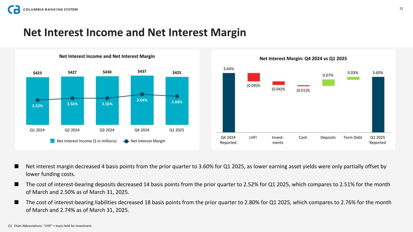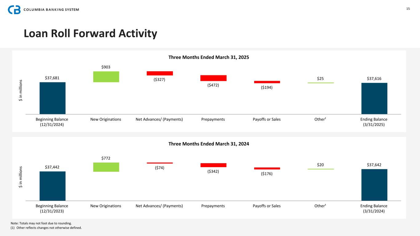 选择3月31日资产负债到期和重新定价时间表(以月为单位),2025(百万美元)< = 34至67至1213至2425至3636 +合计%总额(3)贷款固定(到期)(2)360美元170美元258美元707美元1219美元10,515美元13,22935%浮动(重新定价)(2)13,529 ———— 13,52936%可调整(重新定价)6673095221,5091,2356,99211,23430%贷款总额14,556美元479美元780美元2,216美元2454美元17,507美元37,992100%定期存款(到期)(4)3,536美元1,376美元921美元140美元15美元14美元6,002平均利率(4)4.10% 3.81% 3.44% 1.80% 0.29% 0.27% 3.86%定期债务(到期)$ 2,550 $ — $ —由于四舍五入,表格可能无法执行。这张幻灯片上的贷款总额不包括采购会计调整。递延费用和成本也导致了这张幻灯片上的贷款总额与收益新闻稿中的贷款总额之间的差异。(1)对于所示的情景,利率模拟假设市场利率在十二个月期间(斜坡)或立即(冲击)平行且持续地按比例移动。2025年3月31日在利率上升和利率下降情景下应用于计息存款的模拟重定价贝塔系数分别为55%和54%。有关利率模拟的更多数据可在哥伦比亚截至2024年12月31日的财政年度的10-K表格中获得。(2)一个月内到期的商业部分贷款被纳入浮动利率贷款类别,而不是固定利率贷款类别,因为这些贷款以类似浮动利率贷款的方式重新定价。(3)浮动利率贷款与prime(占总贷款组合的8%)和1个月基础利率(占总贷款组合的28%)挂钩。当可调整利率贷款重新定价时,它们与跨越1个月期至10年期的利率以及最优惠利率挂钩;最普遍的基础指数利率是6个月期(占总贷款组合的17%)和5年期(占总贷款组合的6%)。(4)3个月及以下到期的定期存款包括平均利率为3.91%的15亿美元客户CD和平均利率为4.38%的20亿美元经纪CD。(5)贷款分为三大类:(1)无下限:贷款无合同下限;(2)在下限:当前利率=下限;(3)在下限:当前利率超过下限。高于下限的金额是基于当前保证金加上当前指数假设贷款在2025年3月31日重新定价。可调整的贷款可能要到很长一段时间才会重新定价,这取决于利率变化的时间和规模。利率模拟对2025年3月31日净利息收入的影响(1)斜坡冲击年份1年2年1年2上升200个基点(0.7)% 0.8%(1.1)% 2.4%上升100个基点(0.3)% 0.4%(0.5)% 1.2%下降100个基点0.3%(0.6)% 0.4%(1.5)%下降200个基点1.0%(1.3)% 1.1%(3.2)%下降300个基点1.9%(2.3)% 1.7%(5.6)%下行利率变动至3月31日的下限,2025年(百万美元)浮动贷款下限以上可调整贷款总额< 25个基点19美元36美元5526至50个基点1146317751至75个基点624911176至100个基点12473197101至125个基点35102137126至150个基点52123175 > 150个基点3,9139,10113,014总计4,319美元9,547美元13,866美元下限:3月31日浮动和可调整利率贷款,2025年(百万美元)无楼层(5)在楼层(5)以上楼层(5)浮动总额8,894美元316美元4,319美元13,529美元可调整1,552,1359,54711,234美元总额10,446美元451美元13,866美元24,763%总额42% 2% 56% 100%