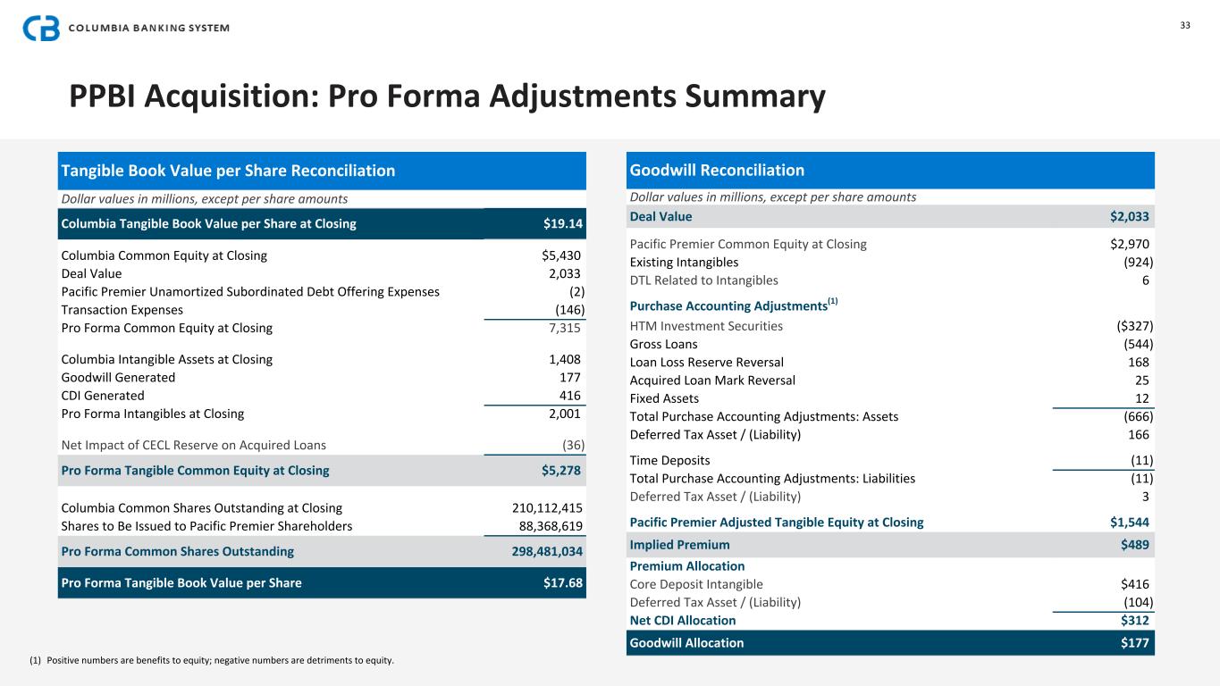 PPBI收购:关键备考财务假设32独立收益▪预计1.27亿美元的全额运营成本节省,或占Pacific Premier非利息支出的30%▪预计2026年实现成本节约75%,此后实现100%▪预计收入将显着增加,但未包含在已公布的财务指标中协同效应公允价值和利率标记(税前)▪Pacific Premier贷款总额减记4.49亿美元,或其收盘时预计总贷款的3.6%(在贷款的剩余期限内增加)▪3.27亿美元的持有至到期证券减记(在证券的剩余期限内增加)▪9100万美元的可供出售证券减记(截至收盘对有形普通股没有影响,证券剩余存续期累计)▪2500万美元逆转Pacific Premier收购贷款上的现有标记(逆转收购贷款剩余期限内的相关增值)▪1200万美元的固定资产减记(在这些资产的剩余年限内折旧)▪1100万美元的定期存款减记(在定期存款的剩余期限内摊销)▪哥伦比亚的共识收益估计和太平洋总理▪Pacific Premier核心存款的3.3%的核心存款无形资产(按年加总位数在10年内摊销)▪Pacific Premier在交易结束前调用其2.75亿美元的未偿次级债CDI &其他假设(1)反映了Pacific Premier截至2025年3月31日的不良贷款。▪税后1.45亿美元,100%在收盘时或收盘前实现,用于说明目的一次性成本信用标记/CECL影响▪9600万美元的税前减记,或Pacific Premier收盘时预计总贷款的0.8%(相当于不良贷款的3.5倍(1))⑤ 4800万美元,或总信用标记的50%,分配给购买信用恶化(“PCD”)贷款⑤ 4800万美元,或总信用标记的50%,分配给非PCD贷款(在贷款剩余期限内计入收益)▪第二天CECL准备金4800万美元,等于非PCD贷款的标记