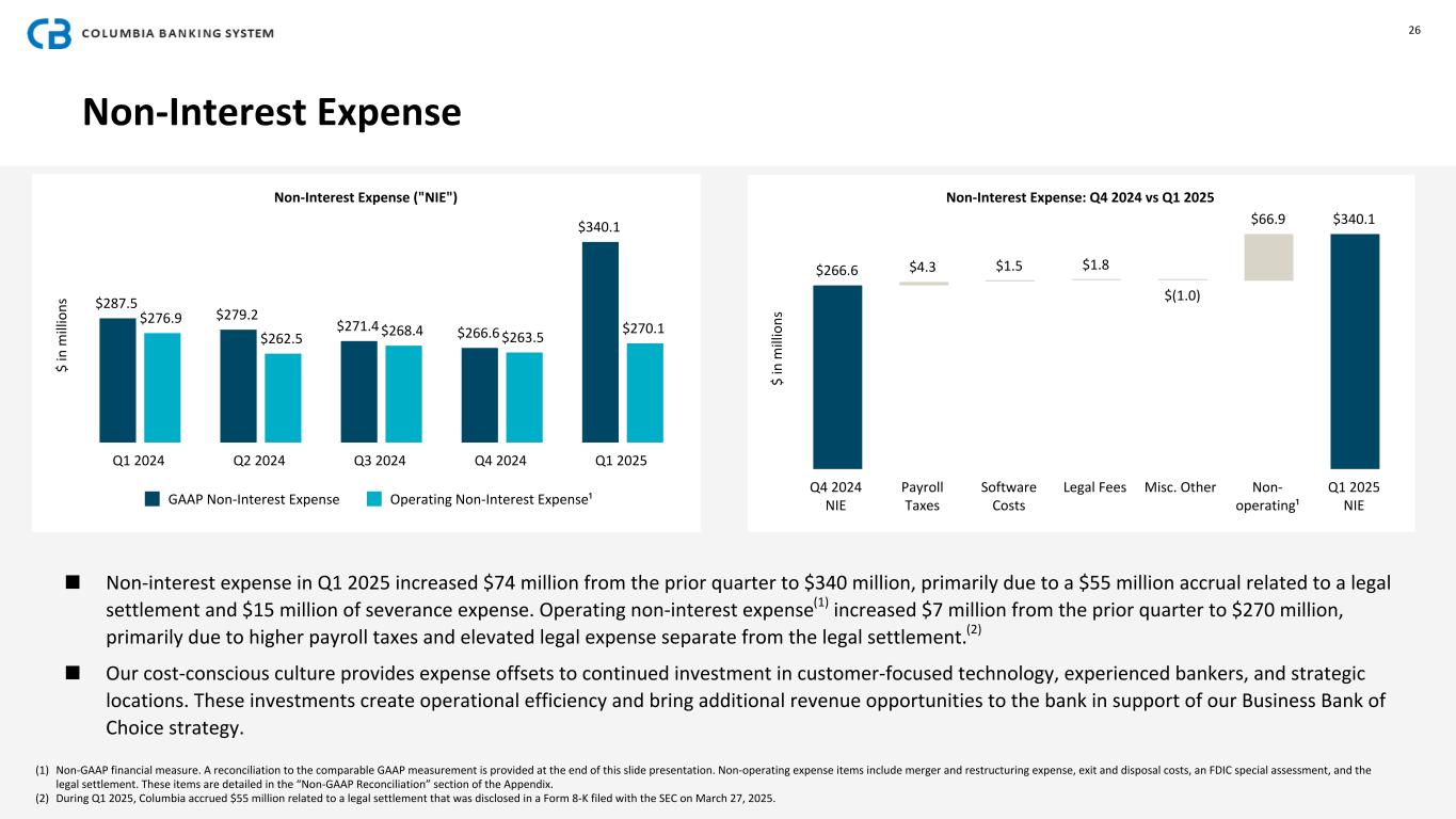 非利息费用26美元在m病io ns非利息费用(“NIE”)$ 287.5 $ 279.2 $ 271.4 $ 266.6 $ 340.1 $ 276.9 $ 262.5 $ 268.4 $ 263.5 $ 270.1 GAAP非利息费用经营非利息费用丨Q1 2024 Q2 2024 Q3 2024 Q4 2024 Q1 2025 ■ 2025年第一季度非利息费用较上一季度增加7400万美元至3.4亿美元,主要是由于与法律和解相关的5500万美元应计费用和1500万美元的遣散费。运营非利息支出(1)较上一季度增加700万美元至2.7亿美元,这主要是由于工资税增加以及与法律和解分开的法律支出增加。(2)■我们注重成本的文化为持续投资于以客户为中心的技术、经验丰富的银行家和战略地点提供了费用抵消。这些投资创造了运营效率,并为银行带来了额外的收入机会,以支持我们的首选商业银行战略。$ in m ill io ns non-interest expense:Q4 2024 vs Q1 2025 $ 266.6 $ 4.3 $ 1.5 $ 1.8 $(1.0)$ 66.9 $ 340.1 Q4 2024 NIE Payroll taxes software costs legal fees misc。其他非经营性丨2025年Q1 NIE(1)Non-GAAP财务计量。本幻灯片演示文稿末尾提供了与可比GAAP计量的对账。营业外支出项目包括合并重组费用、退出和处置费用、FDIC特别评估、法律和解。这些项目在附录的“非GAAP调节”部分中有详细说明。(2)在2025年第一季度,哥伦比亚累积了5500万美元,与2025年3月27日向SEC提交的8-K表格中披露的法律和解有关。