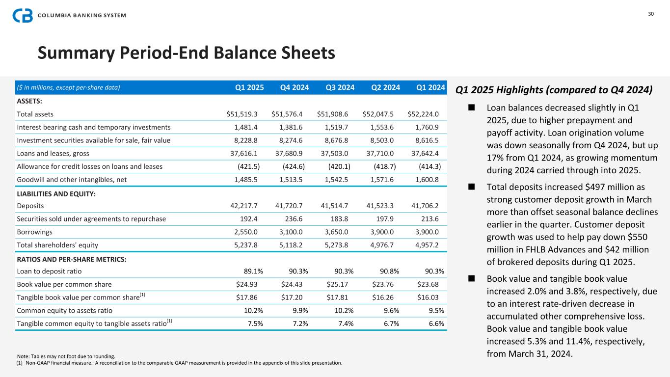 期末资产负债表摘要注:由于四舍五入,表格可能不够用。(1)Non-GAAP财务计量。本幻灯片演示的附录中提供了与可比GAAP计量的对账。(百万美元,每股数据除外)Q1 2025 Q4 2024 Q3 2024 Q2 2024 Q1 2024资产:总资产$ 51,519.3 $ 51,576.4 $ 51,908.6 $ 52,047.5 $ 52,224.0计息现金和临时投资1,481.41,381.61,519.71,553.61,760.9可供出售投资证券,公允价值8,228.88,274.68,676.88,503.08,616.5贷款和租赁,毛额37,616.13 7,68 0.937,503.037,710.037,642.4贷款和租赁信用损失准备金(421.5)(424.6)(420.1)(418.7)(414.3)商誉和其他无形资产,净额1,485.51,513.51,542.51,571.61,600.8负债和权益:存款42,217.741,720.741,514.741,523.341,706.2根据回购协议出售的证券192.42 36.6 183.8 197.92 13.6借款2,550.03,100.03,650.03,900.03,900.0股东权益总额5,237.85,118.25,273.84,976.74,957.2比率和每股指标:贷存比89.1% 90.3% 90.3% 90.8% 90.3%每股普通股账面价值$ 24.93 $ 24.43 $ 25.17 $ 23.76 $ 23.68每股普通股有形账面价值(1)$ 17.86 $ 17.20 $ 17.81 $ 16.26 $ 16.03普通股权益资产比10.2% 9.9(与2024年第四季度相比)■ 2025年第一季度贷款余额略有下降,原因是提前还款和还款活动增加。与2024年第四季度相比,贷款发放量季节性下降,但比2024年第一季度增长17%,因为2024年期间的增长势头一直延续到2025年。■存款总额增加4.97亿美元,原因是3月份强劲的客户存款增长抵消了本季度早些时候的季节性余额下降。客户存款增长用于帮助支付2025年第一季度5.5亿美元的FHLB预付款和4200万美元的经纪存款。■账面价值和有形账面价值分别增长2.0%和3.8%,因利率驱动累计其他综合损失减少。账面价值和有形账面价值较2024年3月31日分别增长5.3%和11.4%。
