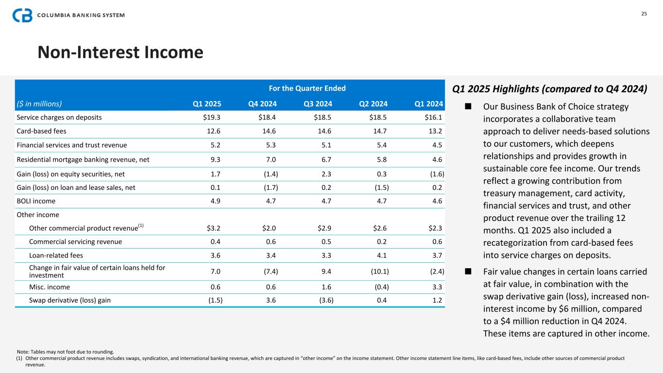 非利息收入注:由于四舍五入,表可能不够用。(1)其他商业产品收入包括掉期、银团、国际银行收入,在损益表“其他收入”中体现。其他损益表项目,如基于卡的费用,包括商业产品收入的其他来源。截至本季度(百万美元)2025年第一季度2024年第四季度2024年第三季度2024年第二季度2024年第一季度存款服务费19.3美元18.4美元18.5美元18.5美元16.1美元卡基费用12.61 4.61 4.61 4.71 3.2金融服务和信托收入5.25.35.15.4 4.5住宅抵押贷款银行业务收入净额9.37.06.75.8 4.6股本证券收益(亏损)净额1.7(1.4)2.3 0.3(1.6)贷款和租赁销售收益(亏损),净额0.1(1.7)0.2(1.5)0.2 BOLI收入4.9 4.7 4.7 4.7 4.6其他收入其他商业产品收入(1)$ 3.2 $ 2.0 $ 2.9 $ 2.6 $ 2.3商业服务收入0.4 0.6 0.5 0.2 0.6与贷款相关的费用3.6 3.4 3.3 4.1 3.7某些为投资而持有的贷款的公允价值变动7.0(7.4)9.4(10.1)(2.4)杂项收入0.6 0.6 1.6(0.4)3.3掉期衍生工具(损失)收益(1.5)3.6(3.6)0.41.2252025年第一季度亮点(与2024年第四季度相比)■我们的业务首选银行战略采用协作团队方法,为我们的客户提供基于需求的解决方案,这加深了关系并提供了可持续的核心费用收入增长。我们的趋势反映出,在过去12个月中,金库管理、卡活动、金融服务和信托以及其他产品收入的贡献越来越大。2025年第一季度还包括将基于卡的费用重新分类为存款服务费。■某些以公允价值计量的贷款的公允价值变动,加上掉期衍生工具收益(损失),使非利息收入增加了600万美元,而2024年第四季度减少了400万美元。这些项目计入其他收入。