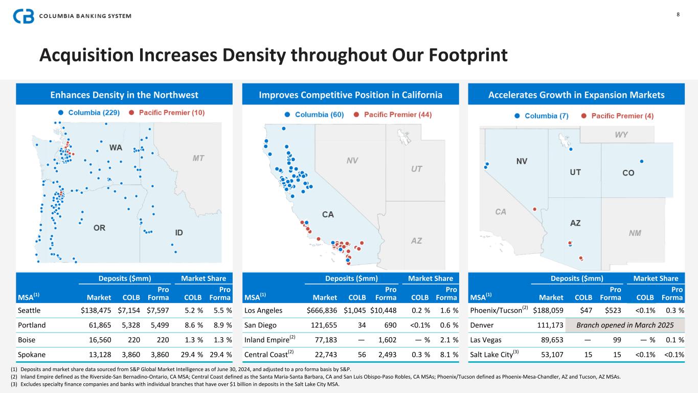 收购Pacific Premier增加规模和机会7(1)截至2025年3月31日,Columbia和Pacific Premier的合并备考财务数据不反映采购会计调整。(2)存款和市场份额数据来源于截至2024年6月30日的标普全球市场情报,并经标普调整为备考口径。南加州定义为:bakersfield-Delano,加利福尼亚州;El Centro,加利福尼亚州;Los Angeles-Long Beach-Anaheim,加利福尼亚州;Oxnard-Thousand Oaks-Ventura,加利福尼亚州;Riverside-San Bernardino-Ontario,加利福尼亚州;San Diego-Chula Vista-Carlsbad,加利福尼亚州;San Luis Obispo-Paso Robles,加利福尼亚州和Santa Maria-Santa Barbara,加利福尼亚州 MSA。(3)Franchise的百分比反映了加拿大皇家银行截至2024年7月31日的存款百分比。在南加州增加规模并增加在南加州西北地区前10名市场份额(2)排名银行存款总额百分比($ mm)特许经营权1 摩根大通 $ 180,8137.5% 2美国银行145,9947.6% 3 富国银行 134,1589.8% 4加拿大皇家银行(3)53,0625.6% 5 美国合众银行 49,6299.5% 6 华美TERM3 43,19072.0% 7 花旗集团 42,6563.3% 8 Axos Financial 17,84392.2% 9 Bank of California 17,74361.6% 10 Pro Forma 14,64426.1% 12 Pacific Premier 13,50992.4% 51 Columbia 1,1352.7% $ 70B Assets $ 51B Loans $ 57B存款备考快照(1)