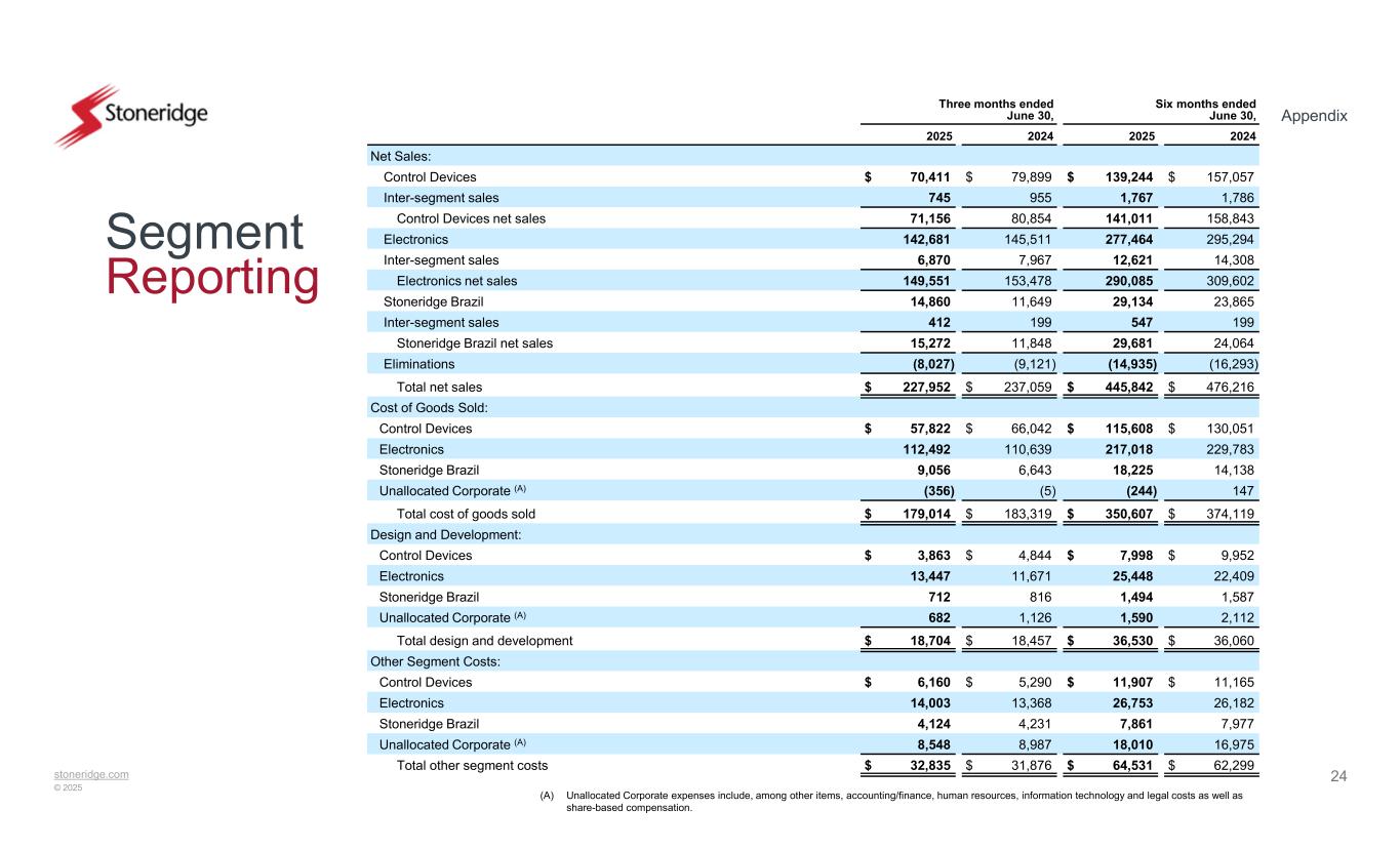 石匠网©2025年附录24分部报告(a)未分配的公司费用包括(其中包括)会计/财务、人力资源、信息技术和法律费用以及基于股份的薪酬。截至6月30日的六个月,截至6月30日的三个月,2024202520242025净销售额:157,057美元139,244美元79,899美元70,411控制设备1,7861,767955745部门间销售额158,843141,0 1180,85471,156控制设备净销售额295,294277,464145,511142,681电子14,30812,6217,9676,870部门间销售额309,602290,085153,478149,551电子净销售额23,86529,13411,64914,860Stoneridge Brazil 199547 199412部门间销售额24,06429,68111,84815,272Stoneridge Brazil Net sales(16,293)(14,935)(9,121)(8和开发其他部门成本:11,165美元11,907美元5,290美元6,160美元控制设备26,18226,75313,36814,003Electronics 7,9777,8614,2314,124Stoneridge Brazil 16,97518,0 108,9878,548未分配企业(a)62,299美元64,531美元31,876美元32,835其他部门成本总额