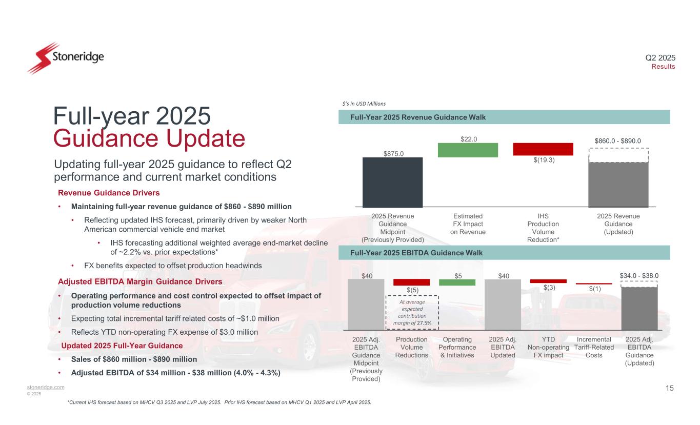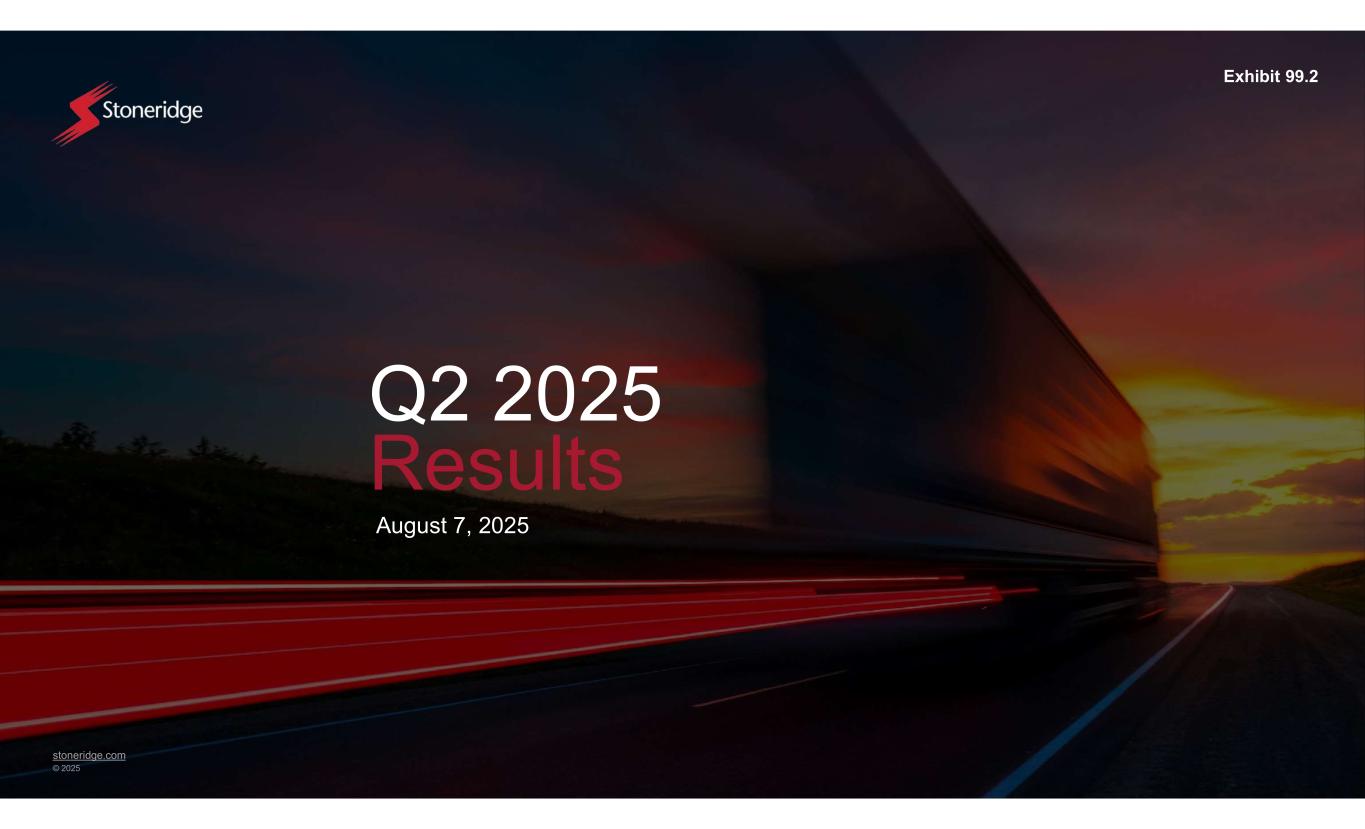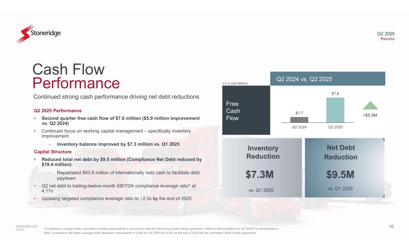 15stoneridge.com©2025年第二季度业绩$ 40 $(5)$ 5 $ 40 $(3)$(1)2025年调整后EBITDA指导中点(先前提供)产量减少经营业绩和举措2025年调整后EBITDA更新年初至今非经营性外汇影响与关税相关的增量成本2025年调整后EBITDA指导(更新)$ 875.0 $ 22.0 $(19.3)2025年收入指导中点(先前提供)估计外汇对收入的影响IHS生产量减少*2025年收入指引(更新)2025年全年指引更新更新2025年全年指引以反映Q2业绩和当前市场状况美元百万美元2025年全年收入指引Walk 2025年全年EBITDA指引Walk平均预期贡献率为27.5%收入指引驱动因素•维持全年收入指引8.6-8.9亿美元•反映更新后的IHS预测,主要受北美商用车终端市场疲软的推动• IHS预测终端市场的额外加权平均降幅约为2.2%,而此前的预期*•预计外汇收益将抵消生产逆风调整后EBITDA利润率指导驱动因素•经营业绩预计成本控制将抵消生产量减少的影响•预计增量关税相关成本总额约为1.0百万美元•反映年初至今非经营性外汇支出为3.0百万美元更新的2025年全年指导•销售额为8.6亿美元-8.9亿美元•调整后EBITDA为3400万美元-3800万美元(4.0%-4.3 %)*当前IHS预测基于MHCV 2025年Q3和LVP2025年7月。此前基于MHCV 2025年Q1和LVP2025年4月的IHS预测。$860.0 - $890.0 $34.0 - $38.0