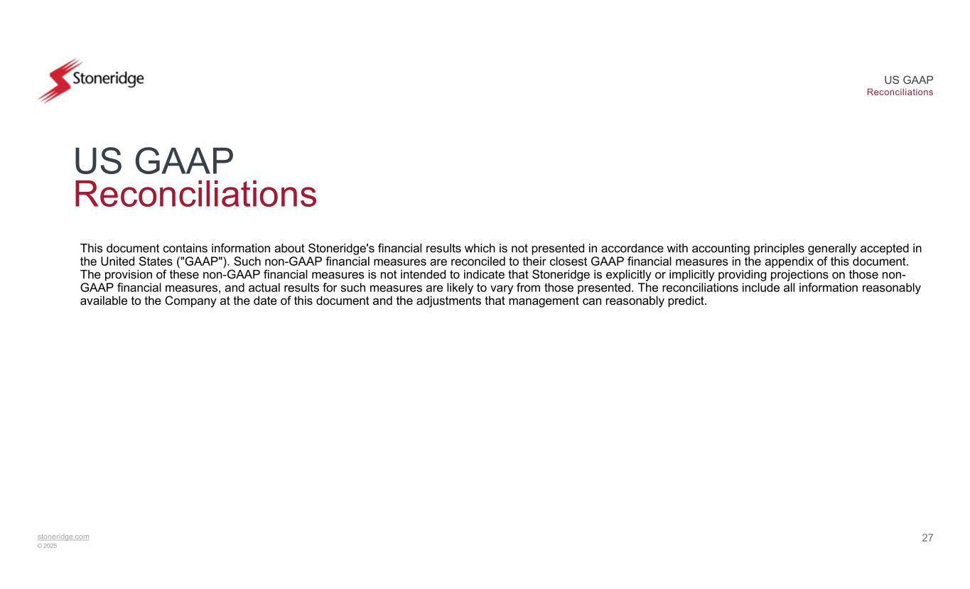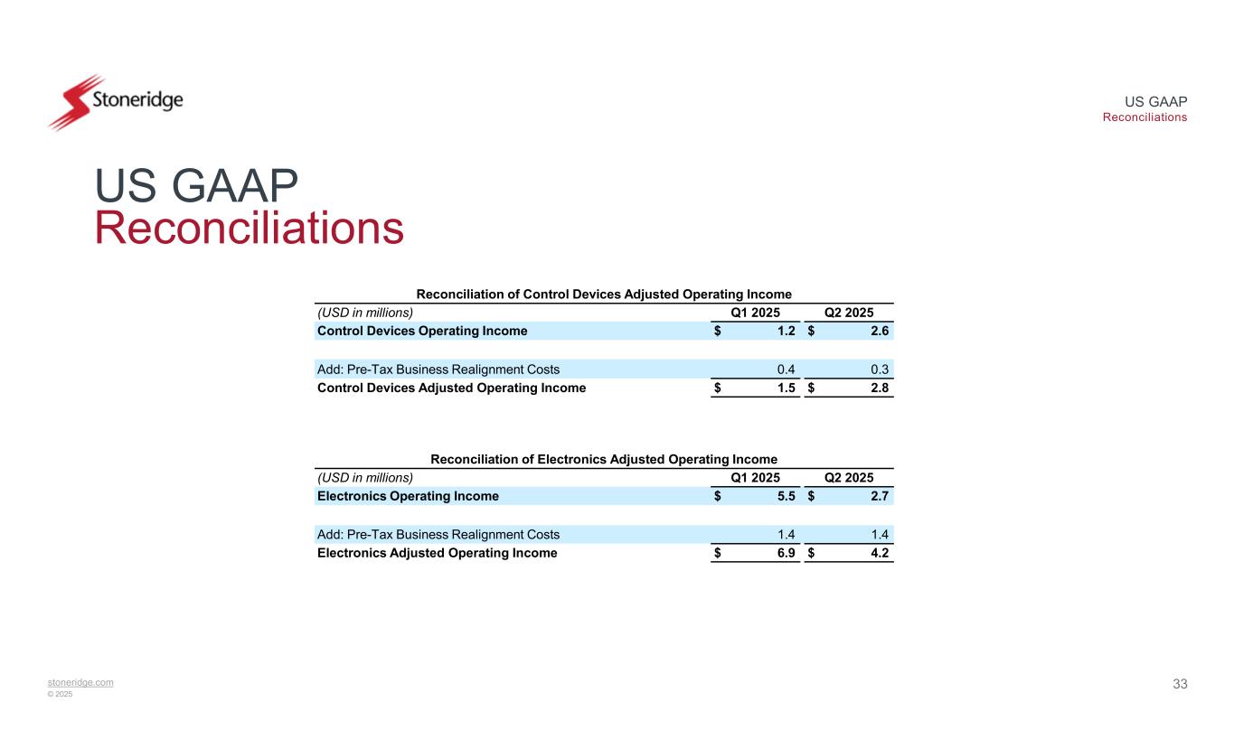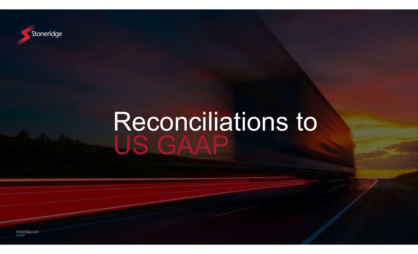 stoneridge.com©2025年美国通用会计准则调节33美国通用会计准则调节调节电子调整后营业收入Q2 2025Q1 2025(百万美元)$ 2.7 $ 5.5电子营业收入1.4 1.4加:税前业务调整成本$ 4.2 $ 6.9电子调整后营业收入调节控制设备调整后营业收入Q2 2025Q1 2025(百万美元)$ 2.6 $ 1.2控制设备营业收入0.3 0.4加:税前业务调整成本$ 2.8 $ 1.5控制设备调整后营业收入