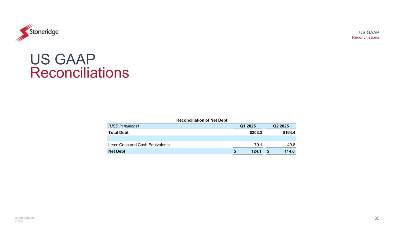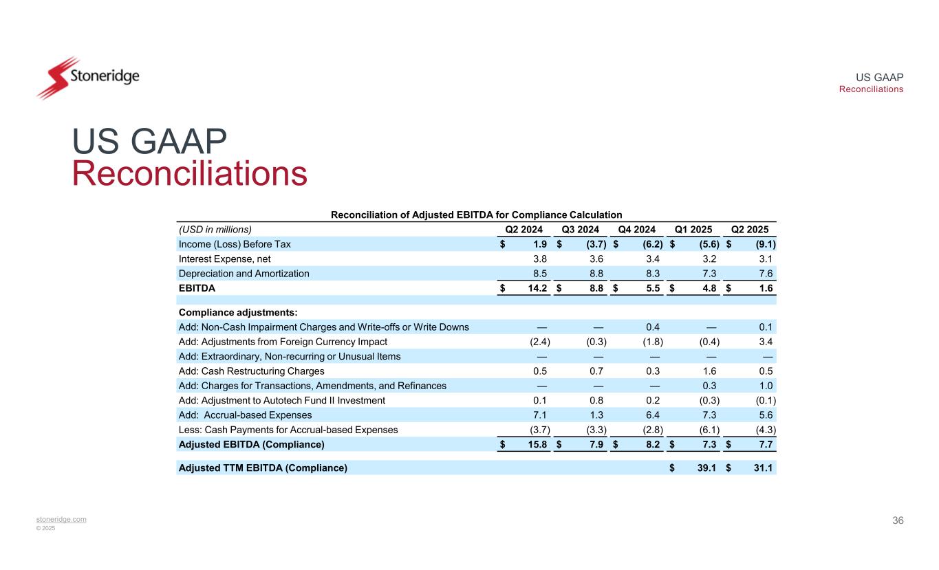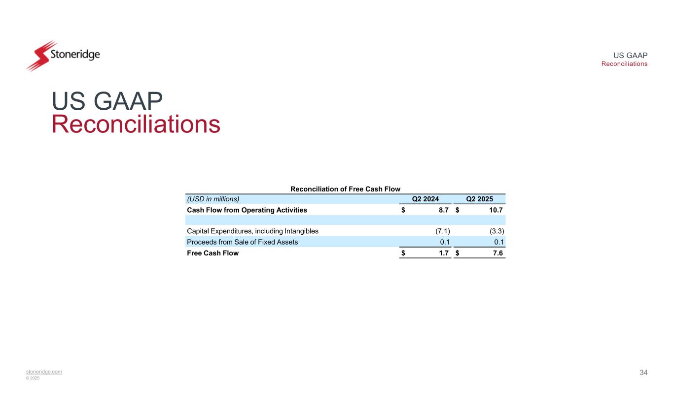stoneridge.com©2025年美国通用会计准则调节33美国通用会计准则调节调节电子调整后营业收入Q2 2025Q1 2025(百万美元)$ 2.7 $ 5.5电子营业收入1.4 1.4加:税前业务调整成本$ 4.2 $ 6.9电子调整后营业收入调节控制设备调整后营业收入Q2 2025Q1 2025(百万美元)$ 2.6 $ 1.2控制设备营业收入0.3 0.4加:税前业务调整成本$ 2.8 $ 1.5控制设备调整后营业收入