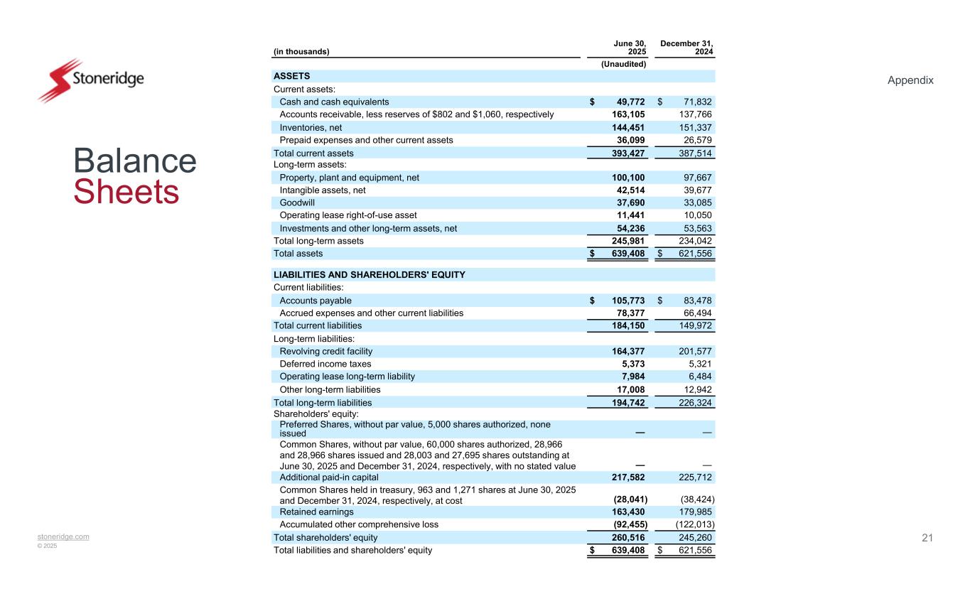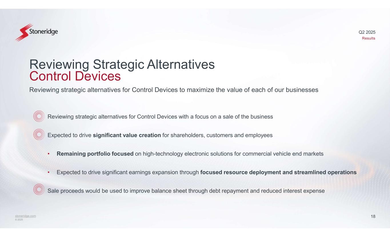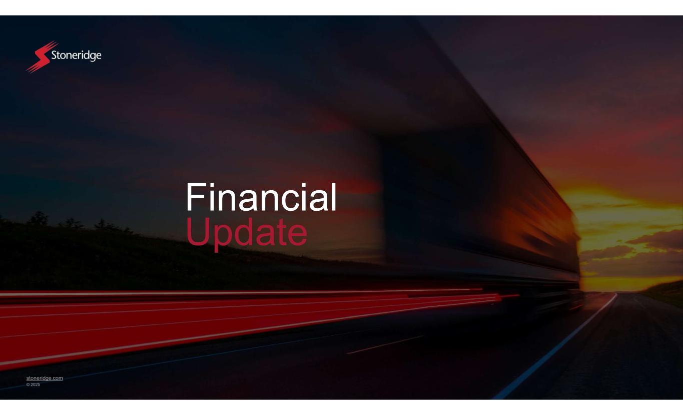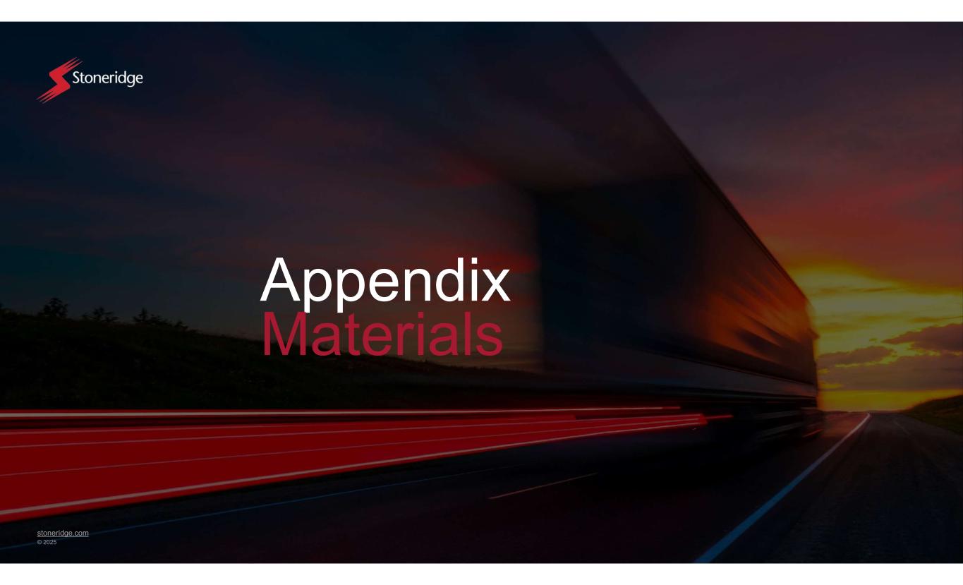 16stoneridge.com©2025年第二季度业绩自由现金流2025年第二季度业绩•第二季度自由现金流760万美元(与2024年第二季度相比改善590万美元)•继续专注于营运资本管理——特别是库存改善•库存余额与2025年第一季度相比改善了730万美元资本Structure •总净债务减少950万美元(合规净债务减少1940万美元)•汇回4380万美元的国际持有现金以促进债务偿还•第二季度净债务与过去12个月EBITDA合规杠杆率*为4.17x •到年底将目标合规杠杆率更新至~2.5x2025年现金流表现持续强劲现金表现推动净债务减少+ 590万美元注:合规净债务杠杆率最高要求为2025年第二季度的5.50倍,根据修订后的信贷安排协议,2025年底为3.50倍*合规杠杆率计算包括根据循环信贷融资协议进行的调整。有关对账,请参考与美国公认会计原则的对账。2024年第二季度对比2025年第二季度对比2025年第一季度净债务减少950万美元对比2025年第一季度减少730万美元库存减少1.7美元7.6美元2024年第二季度2025年第二季度百万美元