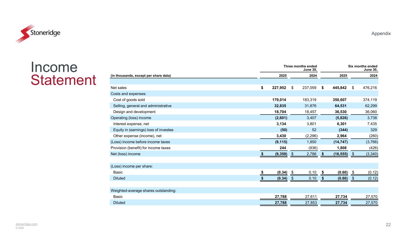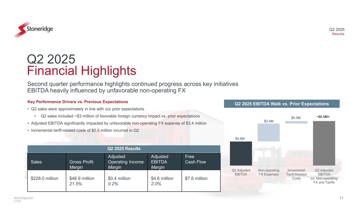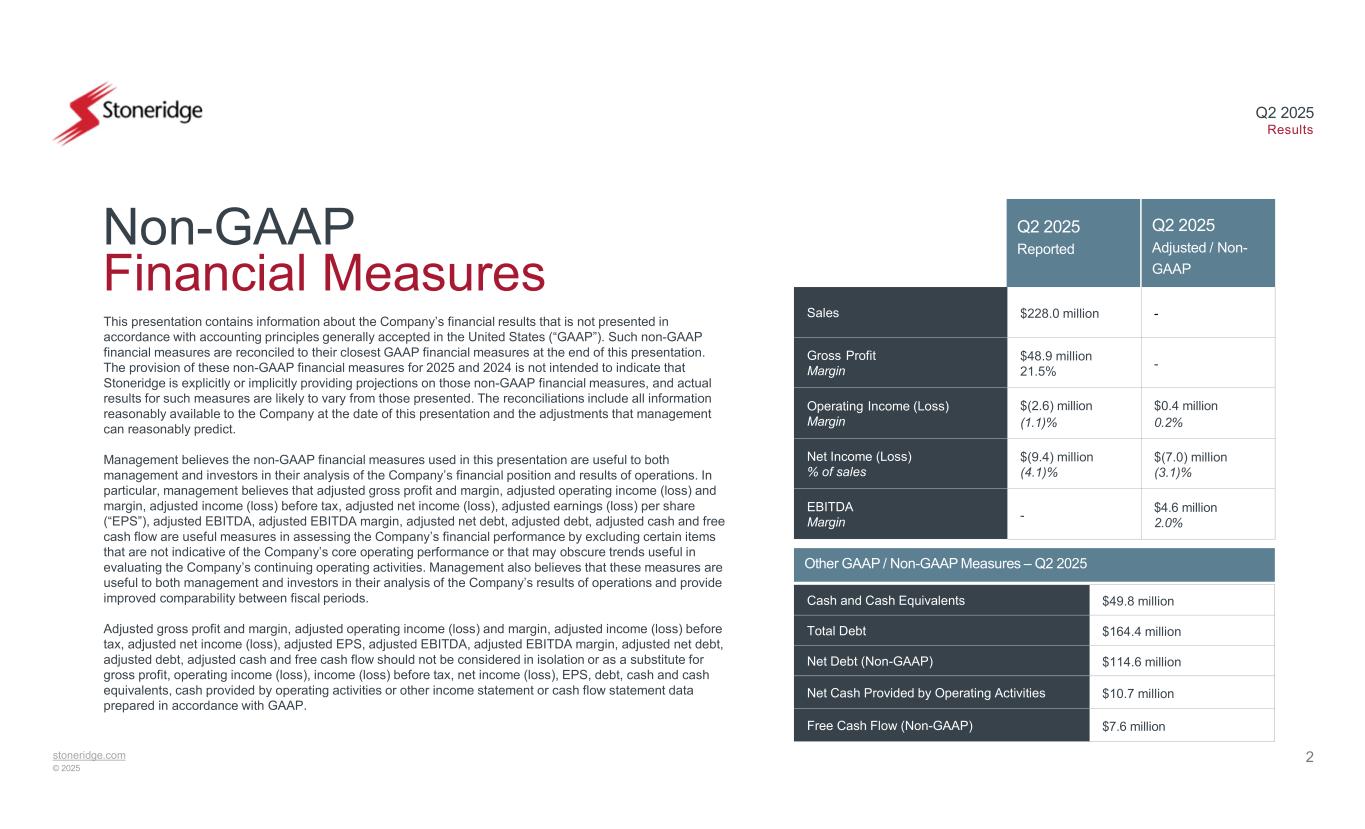 石匠网©2025年Q2 2025年业绩2非GAAP财务指标本演示文稿包含有关公司财务业绩的信息,这些信息未按照美国普遍接受的会计原则(“GAAP”)列报。这类非GAAP财务指标在本演示文稿的末尾与其最接近的GAAP财务指标进行了核对。提供这些2025年和2024年非公认会计原则财务指标并不是要表明斯通里奇正在明示或暗示提供对这些非公认会计原则财务指标的预测,并且此类指标的实际结果可能与所提供的结果不同。这些调节包括公司在本演示文稿发布之日可合理获得的所有信息以及管理层可以合理预测的调整。管理层认为,本演示文稿中使用的非GAAP财务指标对管理层和投资者分析公司的财务状况和经营业绩都很有用。特别是,管理层认为,调整后的毛利率、调整后的营业收入(亏损)和利润率、调整后的税前收入(亏损)、调整后的净收入(亏损)、调整后的每股收益(亏损)(“EPS”)、调整后的EBITDA、调整后的EBITDA利润率、调整后的净债务、调整后的债务、调整后的现金和自由现金流是评估公司财务业绩的有用衡量标准,方法是排除某些项目,这些项目不代表公司的核心经营业绩,或可能掩盖对评估公司持续经营活动有用的趋势。管理层还认为,这些措施对管理层和投资者分析公司的经营业绩都是有用的,并提供了更好的财政期间之间的可比性。调整后的毛利率、调整后的营业收入(亏损)和利润率、调整后的税前收入(亏损)、调整后的净收入(亏损)、调整后的每股收益、调整后的EBITDA、调整后的EBITDA利润率、调整后的净债务、调整后的债务、调整后的现金和自由现金流不应孤立地考虑或作为毛利、营业收入(亏损)、税前收入(亏损)、净收入(亏损)、每股收益、债务、现金和现金等价物、经营活动提供的现金或按照公认会计原则编制的其他损益表或现金流量表数据的替代品。2025年第二季度报告的2025年第二季度调整后/非GAAP-2.28亿美元销售额-4890万美元21.5%毛利率0.4百万美元0.2%(2.6)百万美元(1.1)%营业收入(亏损)利润率(7.0)百万美元(3.1)%(9.4)百万美元(4.1)%净收入(亏损)%销售额4.6百万美元2.0%-EBITDA利润率4980万美元现金和现金等价物1.644亿美元总债务1.146亿美元净债务(non-GAAP)其他GAAP/non-GAAP措施– 2025年第二季度1070万美元经营活动提供的净现金760万美元自由现金流(non-GAAP)