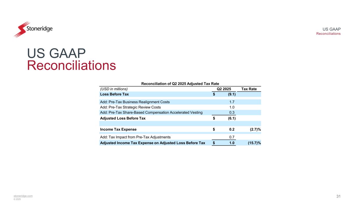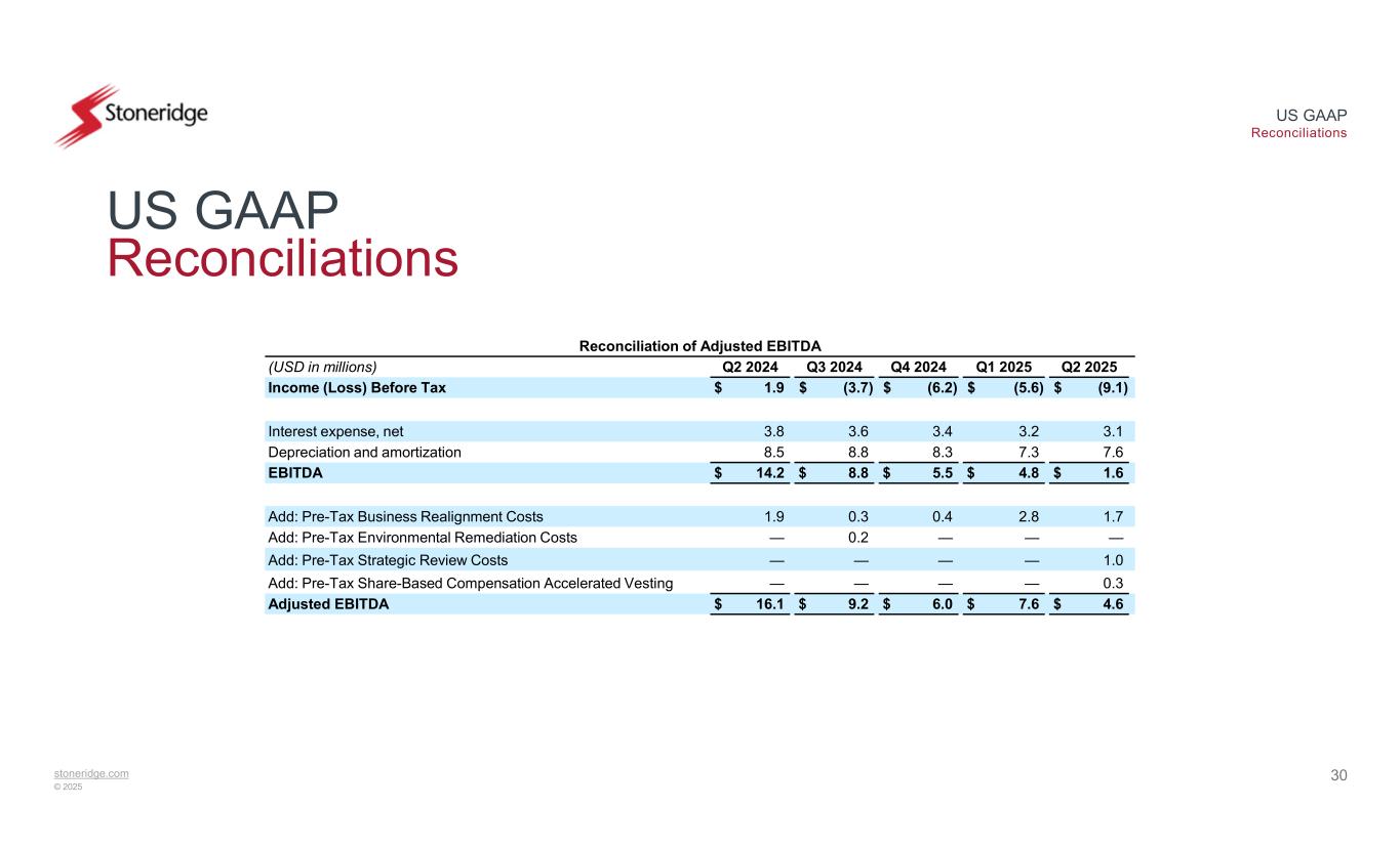 stoneridge.com©2025年美国通用会计准则调节29美国通用会计准则调节调整后营业收入(亏损)调节Q2 2025Q1 2025(百万美元)$(2.6)$(3.2)营业收入(亏损)1.7 2.8add:税前业务调整成本1.0 — add:税前战略审查成本0.3 — add:税前股份补偿加速归属$ 0.4 $(0.4)调整后营业收入(亏损)
