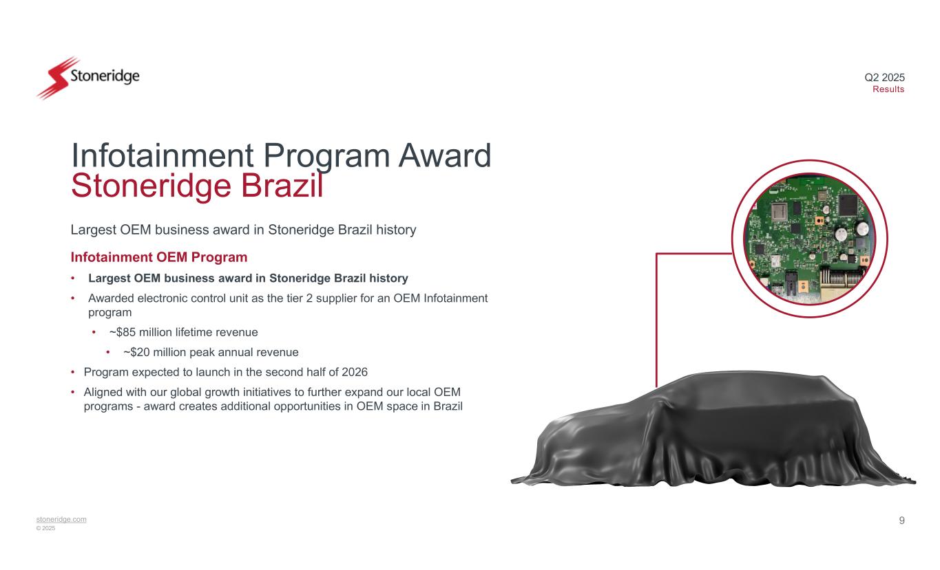 石榴网©2025年第二季度2025年结果信息娱乐计划奖斯通里奇巴西9项信息娱乐OEM计划• 斯通里奇巴西历史上最大的OEM业务奖项•授予电子控制单元为OEM信息娱乐计划的二级供应商•~8500万美元的终身收入•~2000万美元的峰值年收入•该计划预计将于2026年下半年启动•与我们的全球增长计划保持一致,以进一步扩大我们的本地OEM计划-该奖项在巴西的OEM空间中创造更多机会在斯通里奇巴西历史上最大的OEM业务奖项