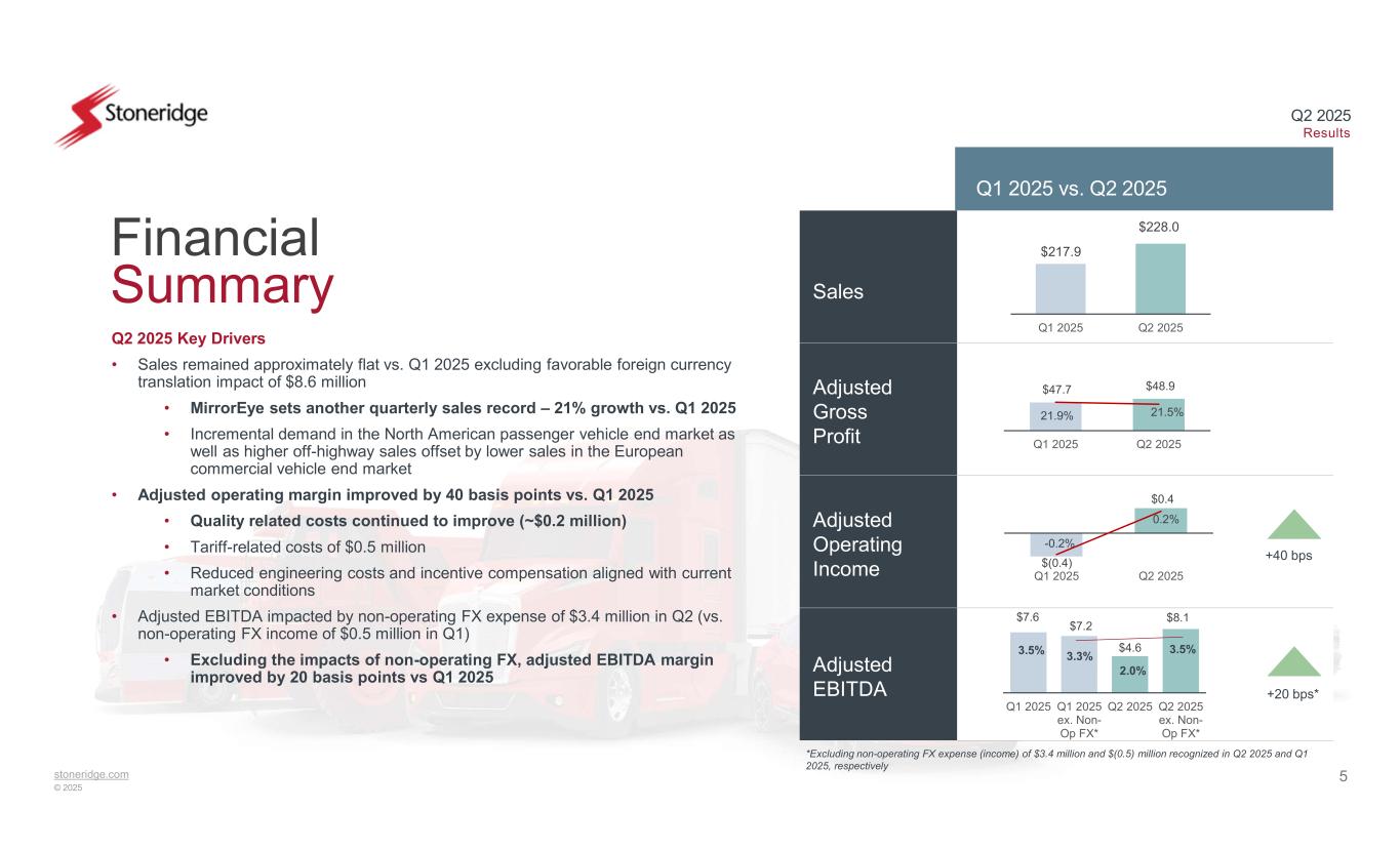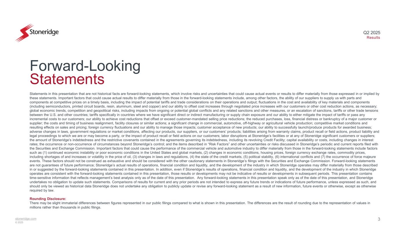 石匠网©2025年Q2 2025年业绩3前瞻性陈述本演示文稿中非历史事实的陈述属于前瞻性陈述,其中涉及可能导致实际事件或结果与这些陈述中明示或暗示的存在重大差异的风险和不确定性。可能导致实际结果与前瞻性陈述中的结果存在重大差异的重要因素包括,除其他因素外,我们的供应商及时以具有竞争力的价格向我们供应零部件的能力,包括潜在关税和贸易考虑对其运营和产出的影响;关键材料和组件(包括半导体、印刷电路板、树脂、铝、钢和铜)的成本和可用性的波动,以及我们通过与客户协商提价或其他必要的成本削减行动来抵消成本增加的能力;全球经济趋势,竞争和地缘政治风险,包括持续或潜在的全球冲突以及任何相关制裁和其他措施的影响,或美国与其他国家之间的制裁、关税或其他贸易紧张局势升级;关税,特别是在我们有重大直接或间接制造或供应链风险的国家,以及我们减轻关税影响或将任何增量成本转嫁给客户的能力;我们实现成本削减以抵消或超过客户规定的售价削减的能力;减少的采购、损失,主要客户或供应商的财务困境或破产;业务重组、设施关闭或类似行动的成本和时机;商用、汽车、非公路或农用车辆生产的重大变化;竞争性市场条件及其对销售和定价的影响;外汇波动和我们管理这些影响的能力;客户对新产品的接受程度;我们成功推出/生产用于已授予业务的产品的能力;法律、政府法规或市场条件的不利变化,影响我们的产品、我们的供应商或我们客户的产品;因保修索赔、产品召回或实地行动而产生的责任,我们现在或可能成为其一方的产品责任和法律诉讼,或产品召回或现场行动对我们客户的影响;斯通里奇设施或任何斯通里奇重要客户或供应商的劳务中断;斯通里奇的债务金额以及管辖其债务的协议中包含的限制性契约,包括其循环信贷融资;资金可用性或成本,包括利率变动;发生或不发生超出斯通里奇控制范围的情况;以及斯通里奇向证券交易委员会备案的定期报告和当前报告中“风险因素”中描述的项目以及其他不确定性或风险中讨论的内容。可能导致商用车和汽车行业表现与前瞻性陈述中的表现存在重大差异的重要因素包括:(1)美国和全球市场的经济持续不稳定或经济状况不佳,(2)经济状况、房价、外汇汇率、商品价格的变化,包括石油短缺和价格上涨或波动,(3)法律法规的变化,(4)信贷市场的状况,(5)政治稳定,(6)国际冲突和(7)不可抗力事件的发生。这些因素不应被解释为详尽无遗,应与斯通里奇向美国证券交易委员会提交的文件中的其他警示声明一起考虑。前瞻性陈述不是对未来业绩的保证;斯通里奇的实际经营业绩、财务状况和流动性,以及斯通里奇经营所在行业的发展可能与本演示文稿中包含的前瞻性陈述中描述或暗示的存在重大差异。此外,即使斯通里奇的经营业绩、财务状况和流动性,以及斯通里奇经营所在行业的发展与本演示文稿中包含的前瞻性陈述一致,这些结果或发展可能并不代表后续期间的结果或发展。本演示文稿包含对时间敏感的信息,这些信息仅反映截至本演示文稿发布之日管理层的最佳分析。本演示文稿中的任何前瞻性陈述仅在本演示文稿发布之日发表, 并且斯通里奇不承担更新此类声明的义务。当前和任何前期的结果比较并非旨在表达任何未来趋势或未来业绩的迹象,除非以此种方式表达,并且仅应被视为历史数据,除非法律另有要求,否则斯通里奇不承担因新信息、未来事件或其他原因而公开更新或修改任何前瞻性陈述的任何义务。四舍五入披露:与本演示文稿中显示的数据相比,我们公开文件中显示的数据之间可能存在轻微的非实质性差异。这些差异是四舍五入的结果,因为在公开文件中,价值以百万为单位而不是以千为单位。