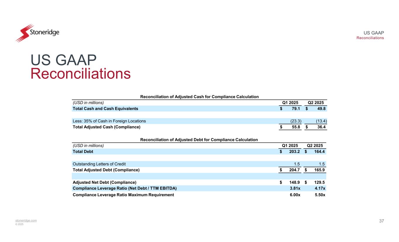 石匠网©2025年美国公认会计原则对账36美国公认会计原则对账调整后EBITDA用于合规计算Q2 2025Q1 2025Q4 2024Q3 2024Q2 2024(百万美元)$(9.1)$(5.6)$(6.2)$(3.7)$ 1.9税前收入(亏损)3.1 3.2 3.4 3.63.8利息支出,净额7.67.38.88.5折旧和摊销$ 1.6 $ 4.8 $ 5.5 $ 8.8 $ 14.2 EBITDA合规调整:0.1 — 0.4 ——加:非现金减值费用和注销或减记3.4(0.4)(1.8)(0.3)(2.4)加:外币影响的调整————加:非常、非经常性或不寻常项目0.5 1.6 0.3 0.7 0.5加:现金重组费用1.0 0.3 ——加:交易、修正费用和再融资(0.1)(0.3)0.2 0.8 0.1Add:调整Autotech Fund II投资5.67.36.4 1.37.1Add:权责发生制费用(4.3)(6.1)(2.8)(3.3)(3.7)减:现金支付权责发生制费用$ 7.7 $ 7.3 $ 8.2 $ 7.9 $ 15.8调整后EBITDA(合规)$ 31.1 $ 39.1调整后TTM EBITDA(合规)