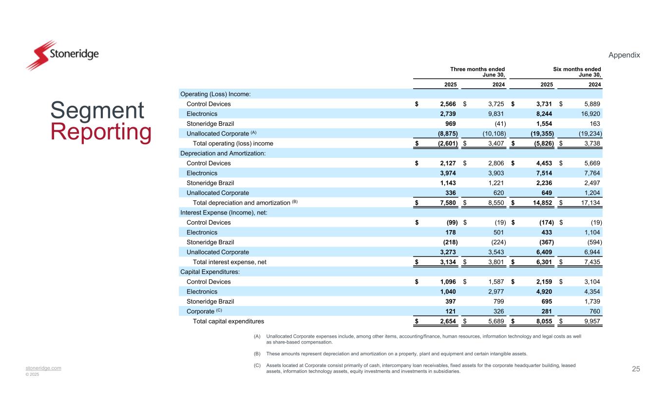 石匠网©2025年附录25分部报告(a)未分配的公司费用包括(其中包括)会计/财务、人力资源、信息技术和法律费用以及基于股份的薪酬。(b)这些金额代表物业、厂房和设备以及某些无形资产的折旧和摊销。(c)位于Corporate的资产主要包括现金、应收公司间贷款、公司总部大楼的固定资产、租赁资产、信息技术资产、股权投资和对子公司的投资。截至6月30日的六个月,截至6月30日的三个月,2024202520242025营业(亏损)收入:5,889美元3,731美元3,725美元2,566Control Devices 16,9208,2449,8312,739Electronics 1631,554(41)969Stoneridge Brazil(19,234)(19,355)(10,108)(8,875)Unallocated Corporate(A)$ 3,738 $(5,826)$ 3,407 $(2,601)Total operating(loss)income depreciation and amortization:$ 5,669 $ 4,453 $ 2,806 $ 2,127 Control Devices 7,76资本支出净额:3,104美元2,159美元1,587美元1,096美元控制设备4,3544,9202,9771,040电子产品1,739695799397Stoneridge Brazil 760281326121Corporate(C)9,957美元8,055美元5,689美元2,654总资本支出