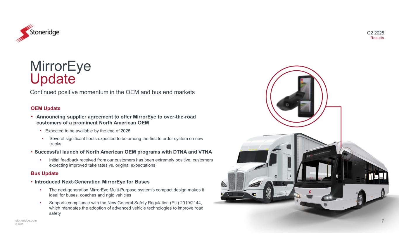 石匠网©2025年第二季度2025年结果MirrorEye OEM全球计划奖6全球MirrorEye计划延长至2033年•与现有商用车OEM客户在欧洲和北美的多个重型卡车铭牌上开展的全球计划•增量、升级的技术•基于该奖项中包含的数量预期,提高了客户假设的采用率•欧洲采用率预计将达到80%以上的峰值斯通里奇历史上最大的OEM计划奖~5.35亿美元预计峰值年收入~1.4亿美元终身总收入6
