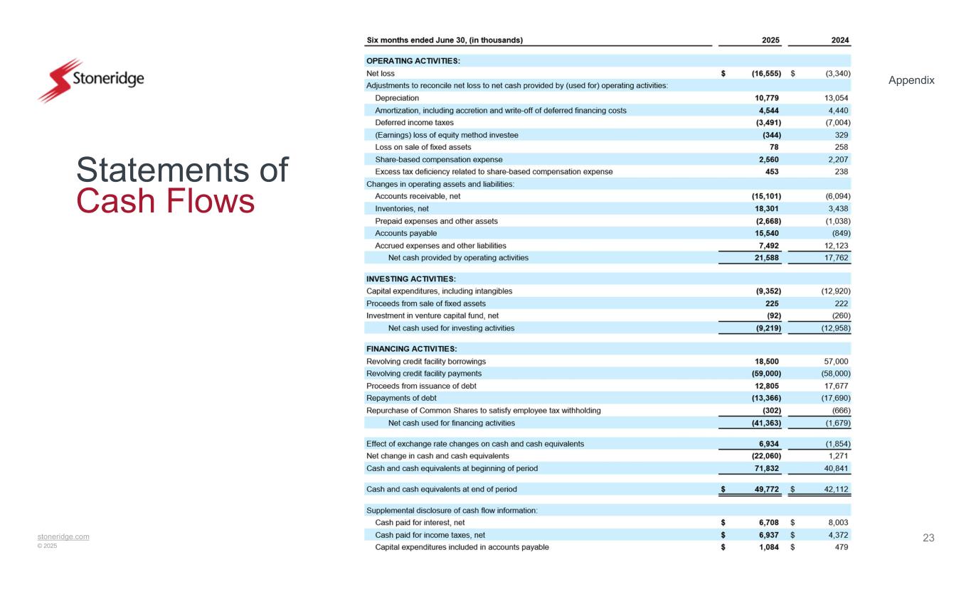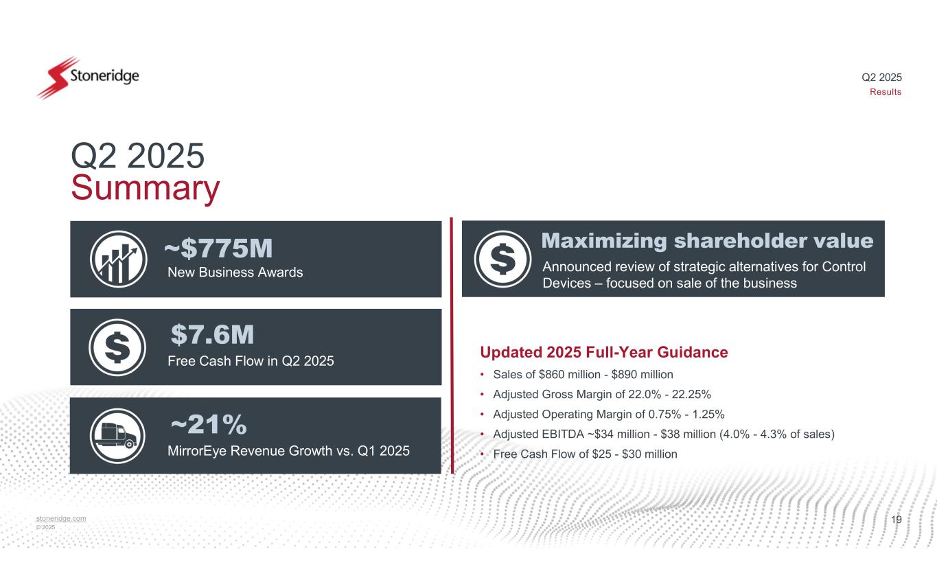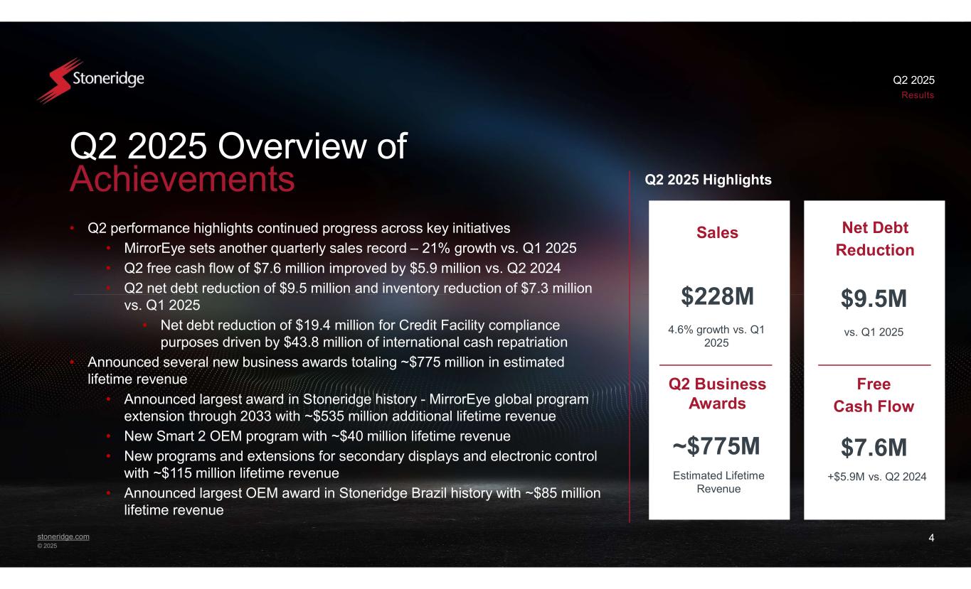 石匠网©2025年2025年第二季度业绩•第二季度业绩突显关键举措的持续进展• MirrorEye再创季度销售纪录–与2025年第一季度相比增长21% •第二季度自由现金流为760万美元,与2024年第二季度相比改善了590万美元•第二季度净债务减少950万美元与2025年第一季度相比,库存减少730万美元•在4380万美元国际现金返还的推动下,出于信贷便利合规目的,净债务减少1940万美元•宣布了几项新的业务奖励,估计终生收入总计约7.75亿美元•宣布了斯通里奇历史上最大的奖励-MirrorEye全球计划延长至2033年,额外终生收入约5.35亿美元•新的Smart 2 OEM计划,终生收入约4000万美元•二级显示器的新计划和扩展和电子控制,终身收入约为1.15亿美元•宣布获得斯通里奇巴西历史上最大的OEM奖项,终身收入约为8500万美元2025年第二季度成果销售概览2.28亿美元与2025年第一季度相比增长4.6% 2025年第二季度亮点与2025年第一季度相比950万美元第二季度商业奖项约为7.75亿美元估计终身收入自由现金流净债务减少760万美元+ 590万美元与2024年第二季度相比4