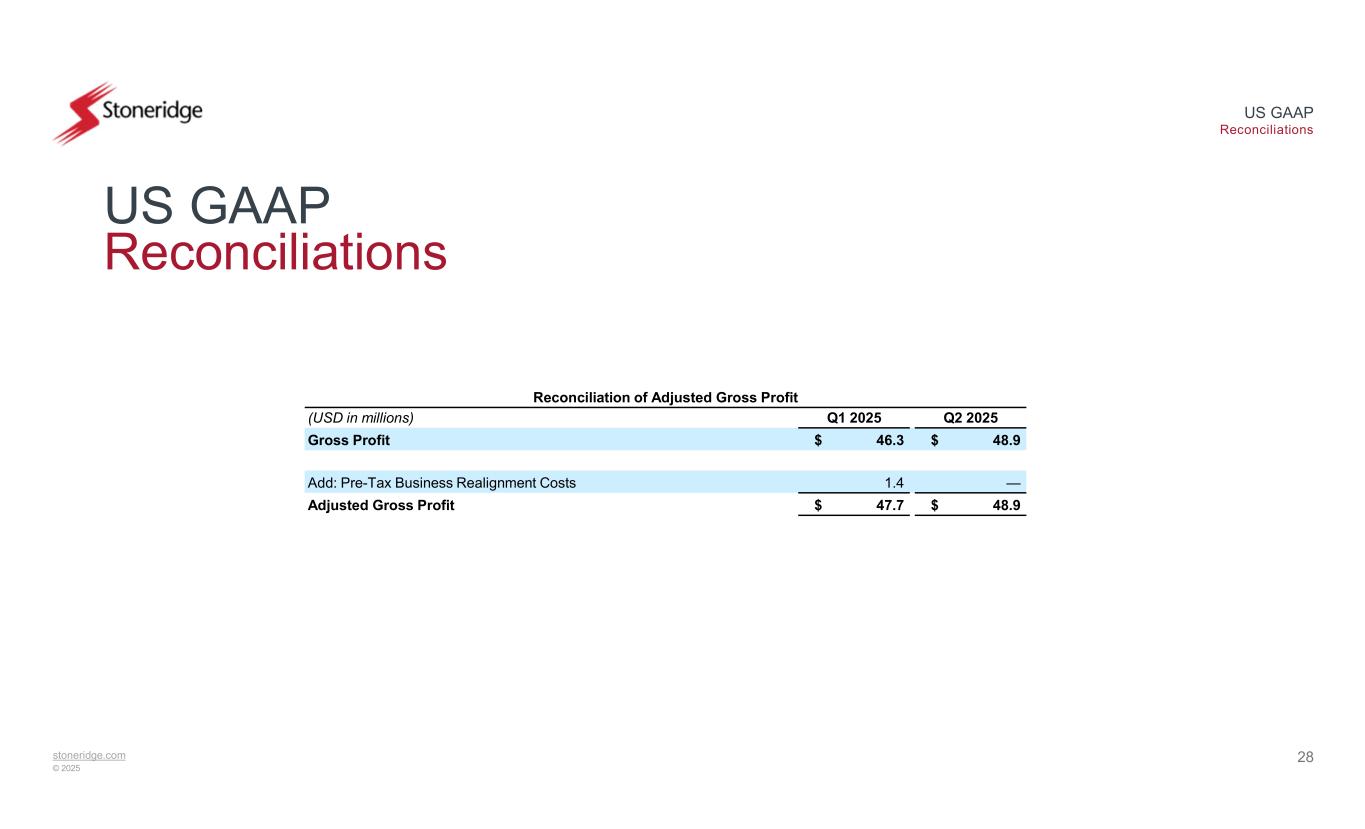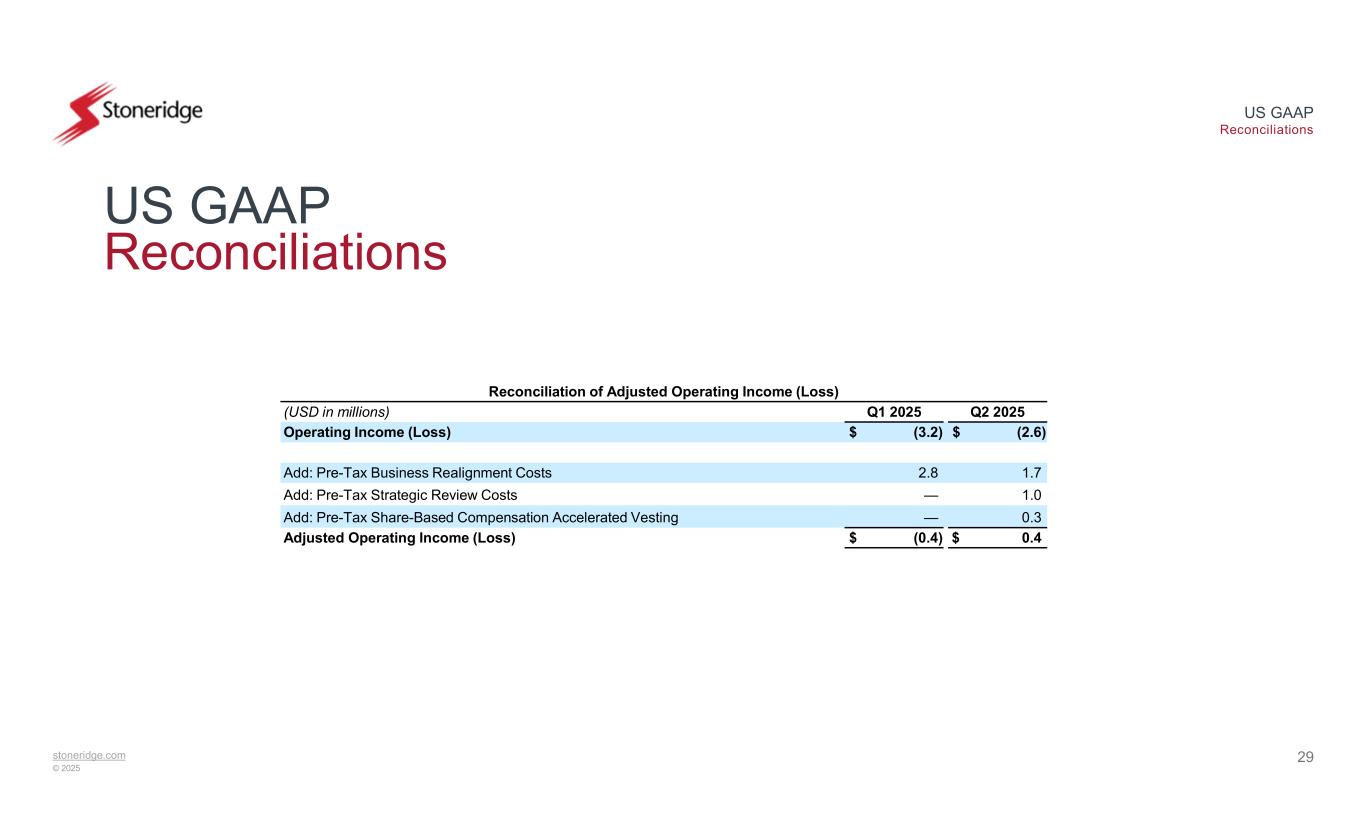 斯通里奇网©2025年美国通用会计准则调节28美国通用会计准则调节调节调整后毛利润Q2 2025Q1 2025(百万美元)$ 48.9 $ 46.3毛利润— 1.4Add:税前业务调整成本$ 48.9 $ 47.7调整后毛利润