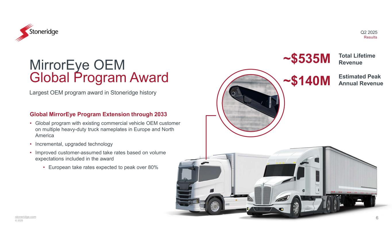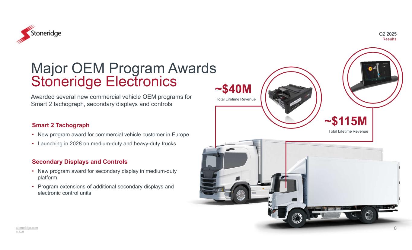 石匠网©2025年第二季度业绩主要OEM计划奖项:斯通里奇电子8 Smart 2转速机•面向欧洲商用车客户的新计划奖项•于2028年在中型和重型卡车二级显示器和控制装置上推出•针对中型平台二级显示器的新计划奖项•额外二级显示器和电子控制装置的计划扩展授予几个新的商用车OEM计划,用于Smart 2转速机、二级显示器和控制装置的总寿命收入~5.35亿美元总寿命收入~4000万美元总寿命收入~1.15亿美元