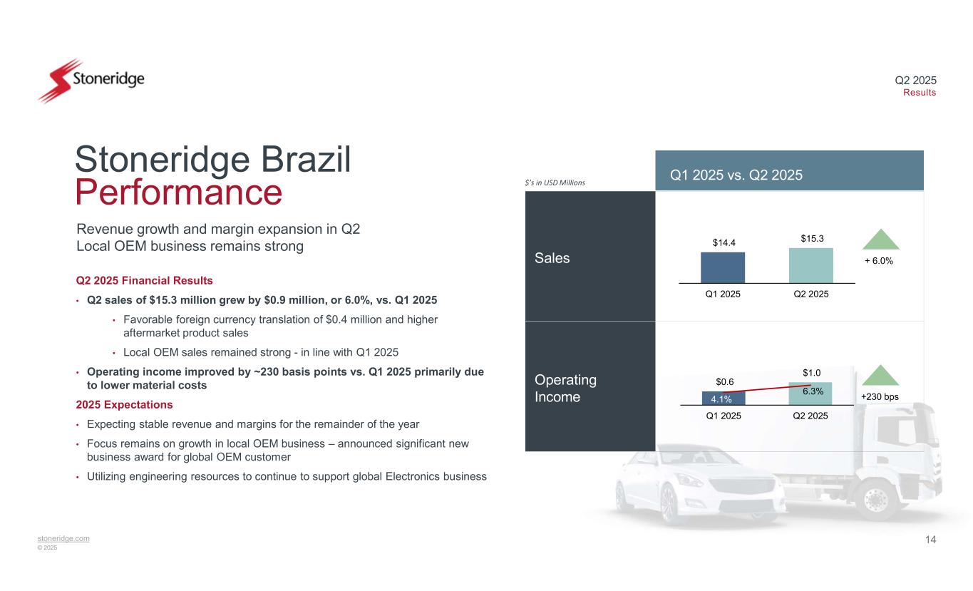 13stoneridge.com©2025年第二季度2025年业绩销售调整后营业收入电子业绩2025年第二季度财务业绩•第二季度销售额与2025年第一季度相对一致,不包括约810万美元的有利外币折算影响• MirrorEye创下另一个季度销售记录,与2025年第一季度相比增长21% •营业收入业绩主要受到不利的销售组合导致的材料成本增加的影响•与2025年第一季度2025年全年预期相比,与质量相关的成本提高了30万美元•显着,北美商用车终端市场持续逆风• MirrorEye收入预计将继续部分抵消产量下降•继续关注材料成本和质量相关改进活动MirrorEye再创季度销售记录质量相关成本持续改善2025年第一季度与2025年第二季度相比百万美元140.5美元149.6美元2025年第一季度2025年第二季度4.9% 6.9美元4.24.9% 2.8% 2025年第一季度2025年第二季度
