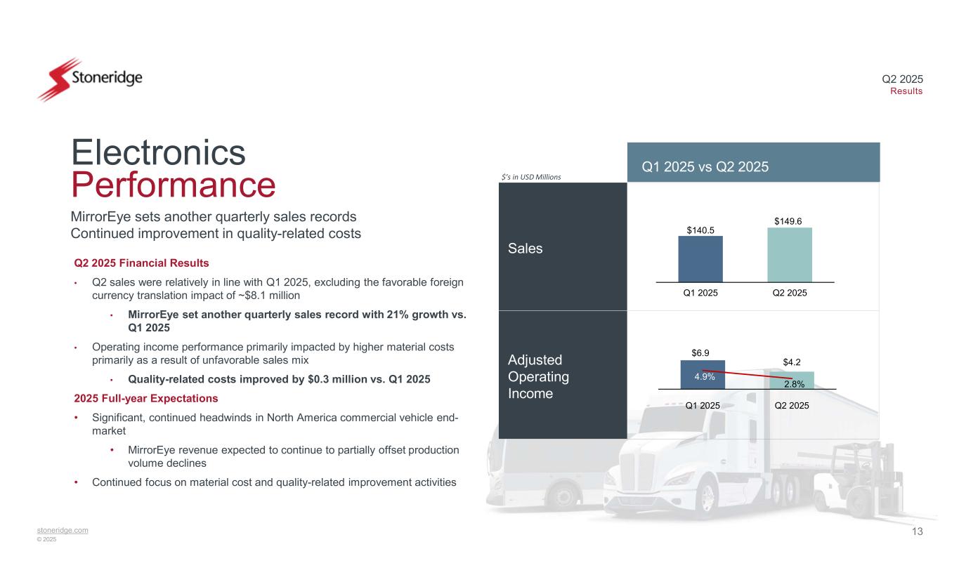 12stoneridge.com©2025年第二季度业绩销售调整后营业收入控制装置业绩2025年第一季度与2025年第二季度相比2025年第二季度财务业绩•第二季度销售额较2025年第一季度增长1.9%,主要是由于北美乘用车终端市场的产量增加•第二季度调整后营业收入较2025年第一季度提高180个基点•间接费用较2025年第一季度改善200个基点,主要是由于经营业绩举措导致的高效制造流程•继续专注于控制运营成本和可自由支配支出2025年全年预期•改善北美乘用车市场状况•重点仍然是降低材料成本和制造业绩,以推动稳定的利润率营业利润率扩大180个基点,这主要是由于制造业绩改善美元百万+ 1.9% + 180个基点$ 69.9 $ 71.2 Q1 2025 Q2 2025 $ 1.5 $ 2.8 2.2% 4.0% Q1 2025 Q2 2025