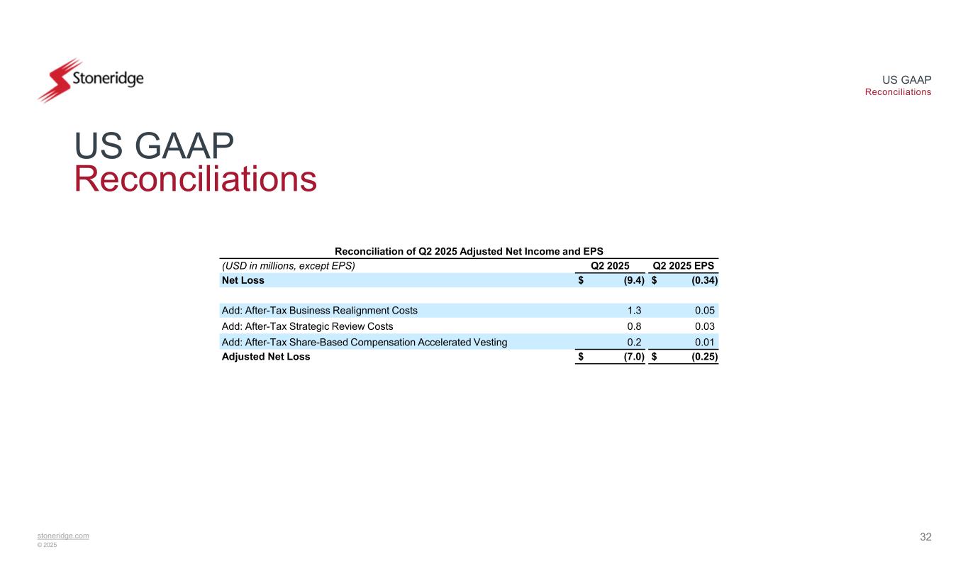 石匠网©2025年美国通用会计准则调节31美国通用会计准则调节2025年第二季度调整后税率税率2025年第二季度(百万美元)$(9.1)税前亏损1.7add:税前业务调整成本1.0add:税前战略审查成本0.3add:税前基于股份的薪酬加速归属$(6.1)调整后税前亏损(2.7)% $ 0.2所得税费用0.7add:税前调整的税收影响(15.7)% $ 1.0调整后税前亏损的调整后所得税费用