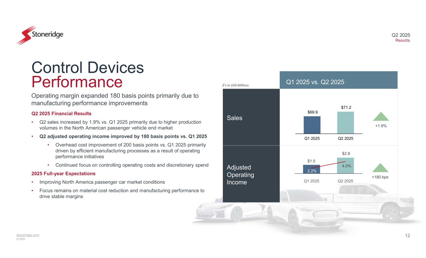 11stoneridge.com©2025年第二季度业绩2025年第二季度财务亮点关键业绩驱动因素与先前预期相比•第二季度销售额与我们先前预期大致一致•第二季度销售额包括约300万美元的有利外汇影响而不是先前预期•调整后EBITDA受到不利的非经营性外汇费用的显着影响340万美元•第二季度业绩产生的与关税相关的增量成本50万美元凸显了关键举措的持续进展EBITDA受到不利的非经营性外汇的严重影响2025年第二季度EBITDA Walk与先前预期相比50万美元340万美元~850万美元+自由现金流调整后EBITDA利润率调整后营业收入利润率毛利率销售760万美元4.6百万美元2.0% 0.4百万美元0.2% 48.9百万美元21.5% 2.28亿美元2025年第二季度业绩Q2调整后EBITDA非经营外汇费用增量关税相关成本Q2调整后EBITDA ex。非经营性外汇和关税460万美元