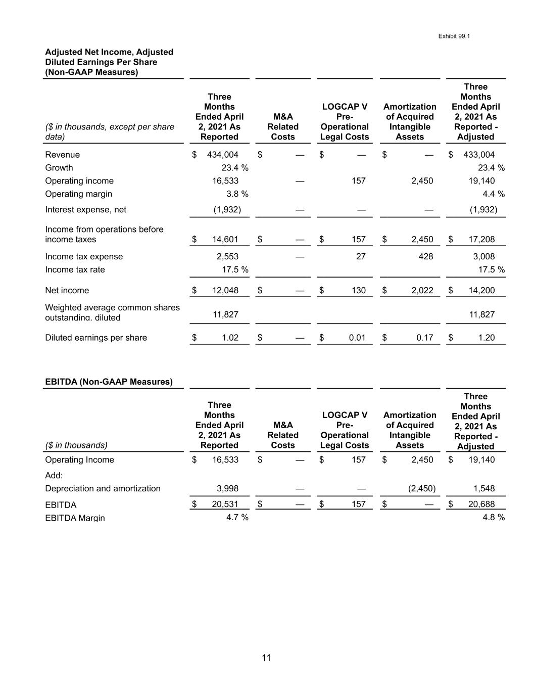 图表99.11调整后的净收入,截至2021年4月2日的三个月,调整后的稀释后每股收益(非GAAP指标)(以千美元为单位,每股数据除外)为报告的并购相关成本LogCap V截至4月2日的三个月的运营前法律成本收购无形资产的摊销,2021年经报告调整的收入为434,004美元$-$-$-433,004增长23.4%23.4%营业收入16,533—157 2,450 19,140营业利润率3.8%4.4%利息支出,净额(1932)——(1932)经营收入所得税前$14,601$-$157$2,450$17,208所得税费用$2,553-27,428 3,008所得税税率17.5%17.5%净收入$12,048$-130$2,022$14,200加权平均在外流通普通股,摊薄后每股收益$1.02$-$0.01$0.17$1.20EBITDA(非GAAP指标)(以千为单位)截至4月2日的三个月,据报告,截至4月2日的三个月中,2021年与并购相关的成本为LogCap V运营前的法律成本收购无形资产的摊销,经报告调整后的2021年营业收入16,533美元-157美元2,450美元19,140美元加:3,998折旧及摊销-(2,450)1,548EBITDA20,531美元-157美元-20,688美元EBITDA利润率4.7%4.8%