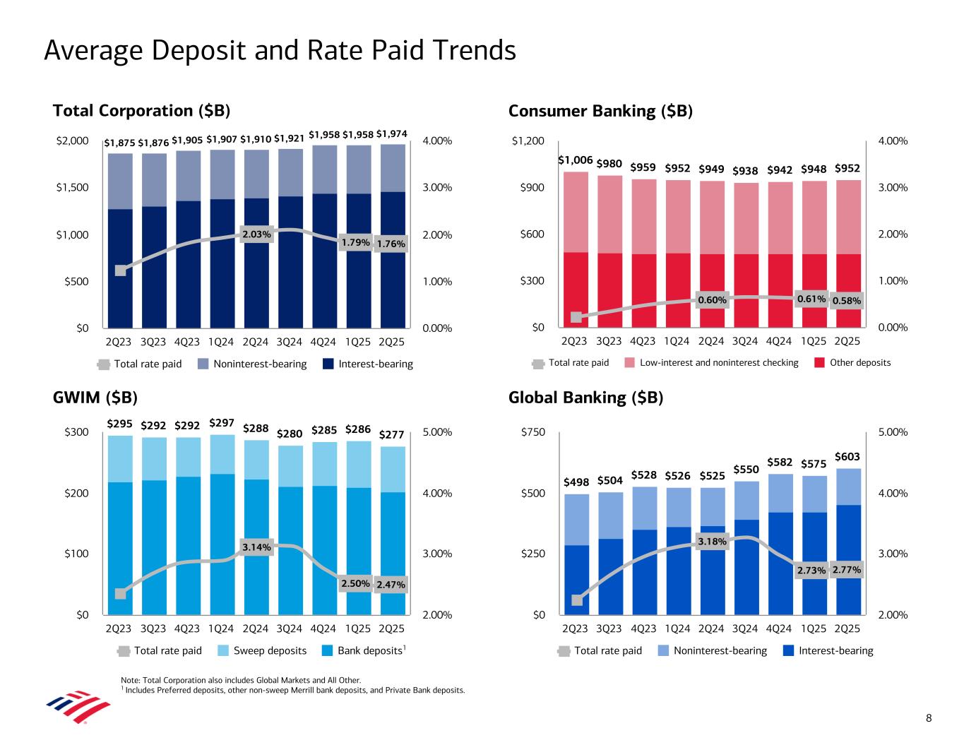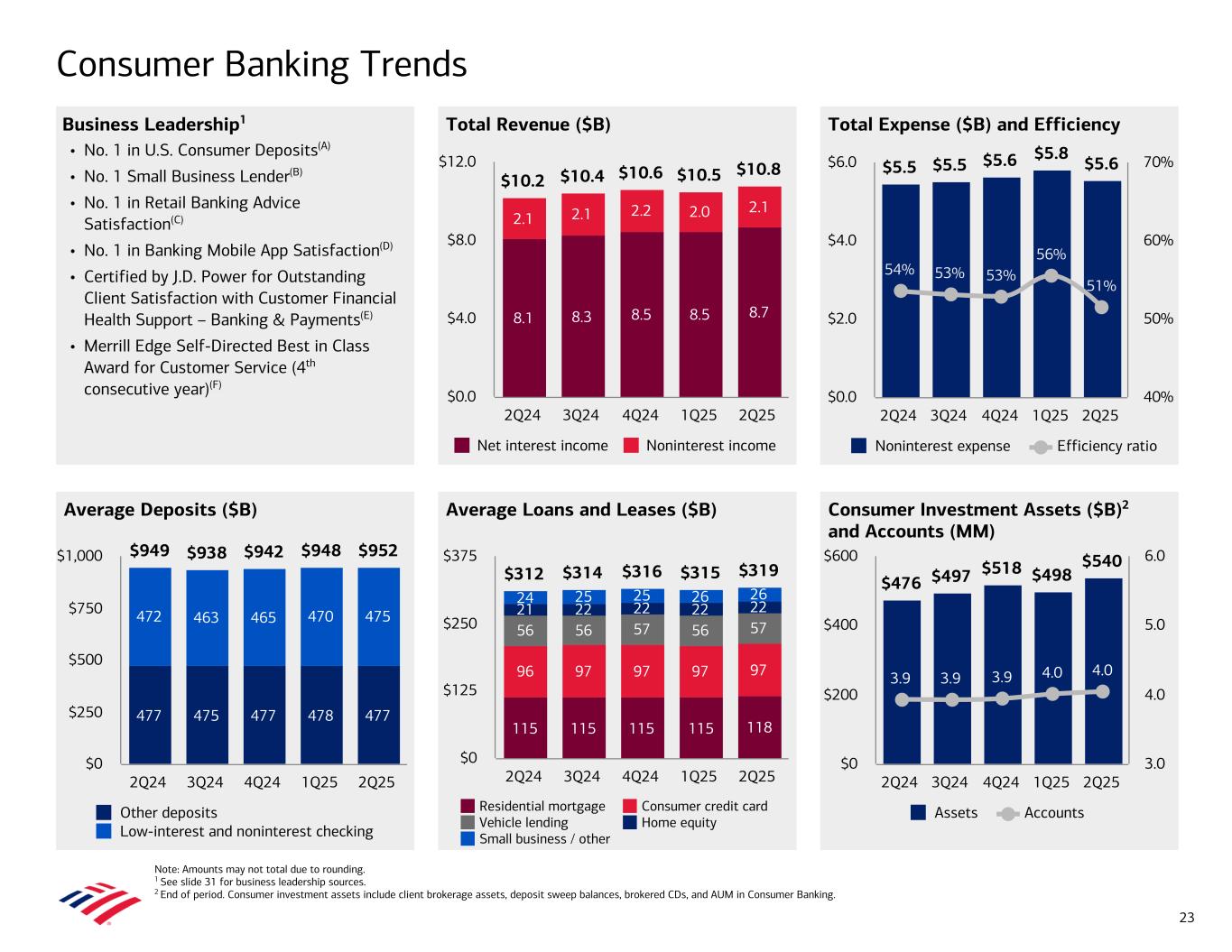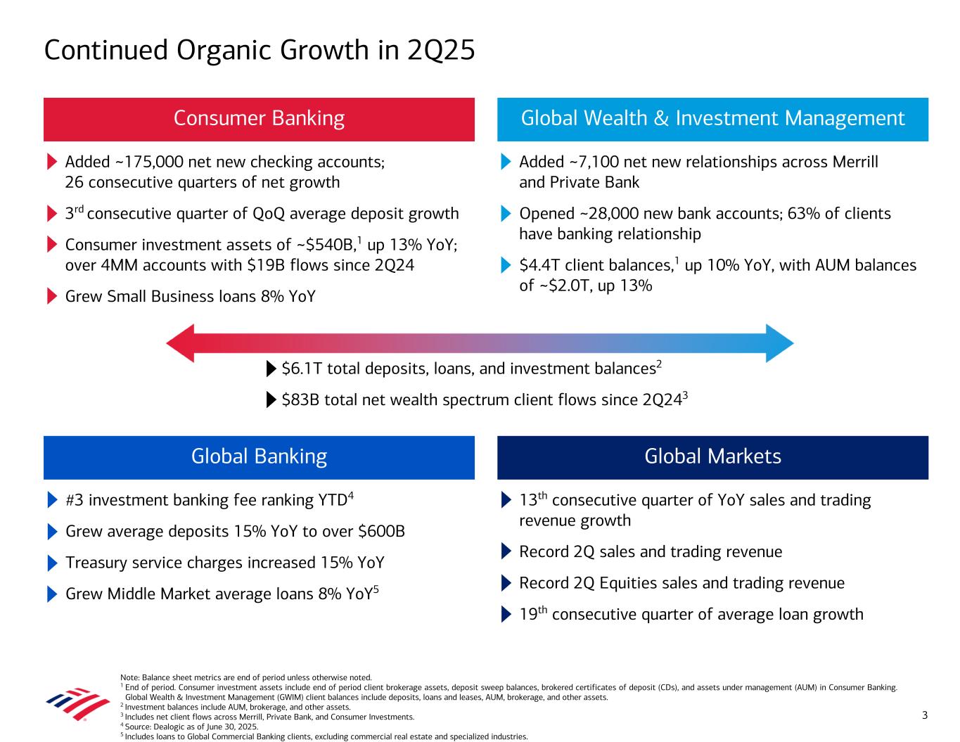 新增约17.5万个净新支票账户;连续26个季度净增长连续3个季度环比平均存款增长消费者投资资产约$ 540B,1同比增长13%;自2Q24以来流动$ 19B的超4mm账户小企业贷款同比增长8%注:除非另有说明,否则资产负债表指标均为期末指标。1期末。消费投资资产包括期末客户经纪资产、存款清扫余额、经纪存单(CDS)以及个人银行业务中的管理资产(AUM)。Global Wealth & Investment Management(GWIM)客户余额包括存款、贷款和租赁、AUM、经纪和其他资产。2投资余额包括AUM、经纪、其他资产。3包括美林、私人银行和消费者投资的客户净流量。4资料来源:Dealogic,截至2025年6月30日。5包括对全球商业银行客户的贷款,不包括商业房地产和专门行业。# 3投资银行费用排名YTD4平均存款同比增长15%至超600B美元资金服务费用同比增长15%中间市场平均贷款同比增长8% 5美林和私人银行新增约7,100个净新关系开设约28,000个新银行账户;63%的客户有银行关系的客户余额为4.4T美元,1同比增长10%,AUM余额约为2.0T美元,增长13% 2Q25继续有机增长3消费者银行全球财富与投资管理全球银行全球市场总存款、贷款总额为6.1T,和投资余额2 $ 83B自2Q243以来的总净财富频谱客户流量连续13个季度同比销售和交易收入增长创纪录2季度销售和交易收入创纪录2季度股票销售和交易收入连续19个季度平均贷款增长