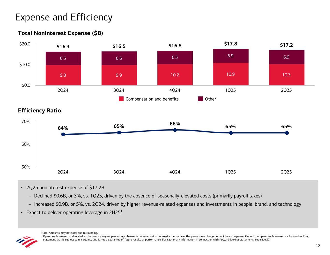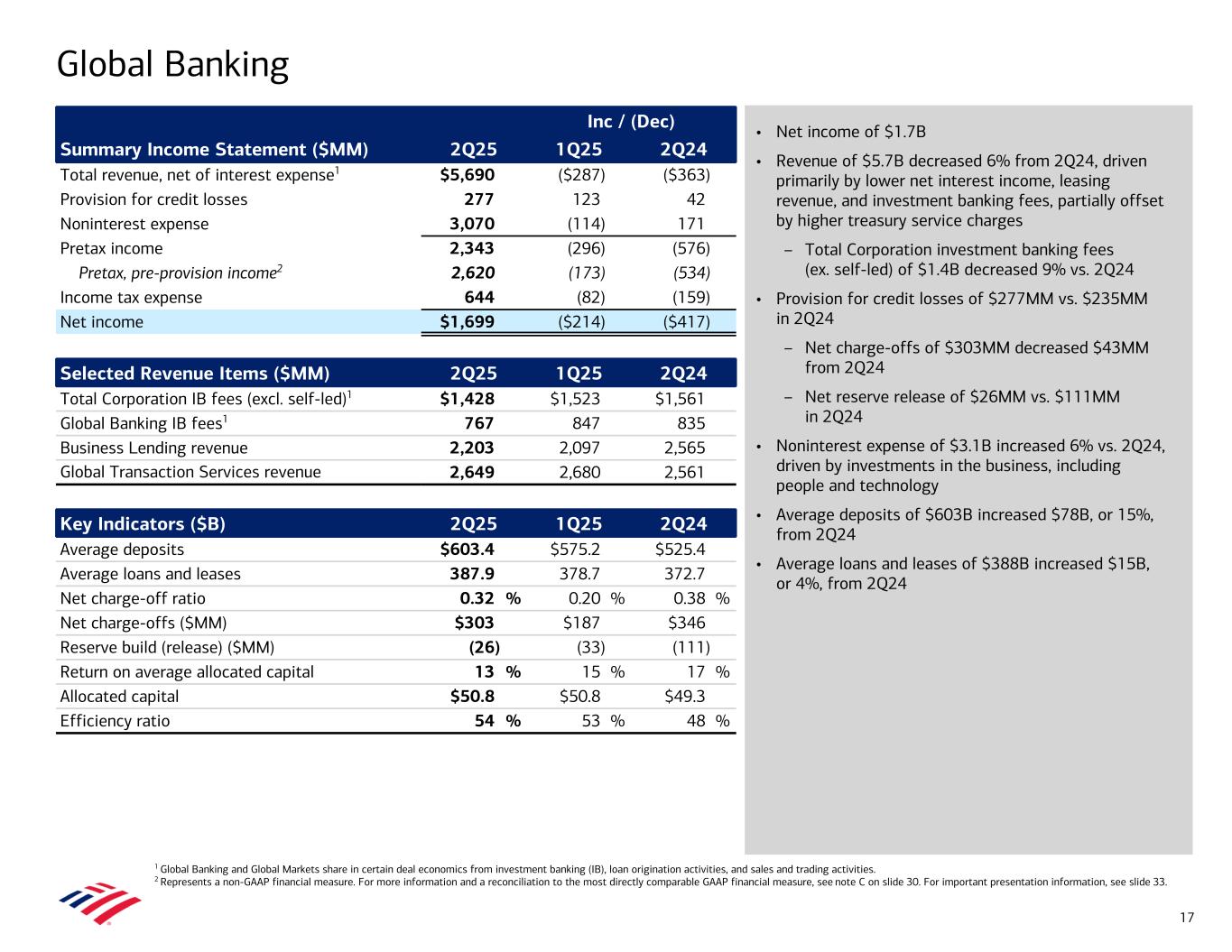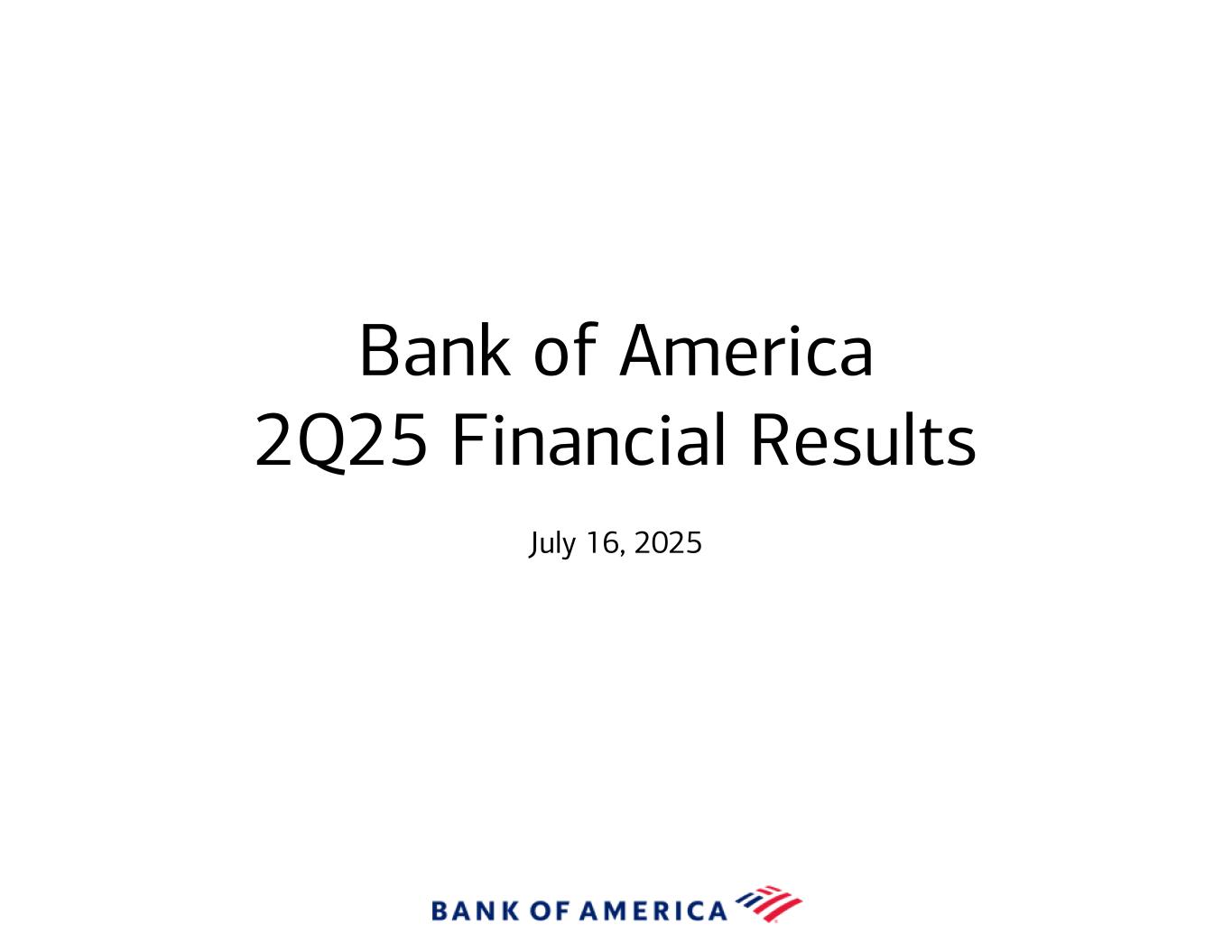 新增约17.5万个净新支票账户;连续26个季度净增长连续3个季度环比平均存款增长消费者投资资产约$ 540B,1同比增长13%;自2Q24以来流动$ 19B的超4mm账户小企业贷款同比增长8%注:除非另有说明,否则资产负债表指标均为期末指标。1期末。消费投资资产包括期末客户经纪资产、存款清扫余额、经纪存单(CDS)以及个人银行业务中的管理资产(AUM)。Global Wealth & Investment Management(GWIM)客户余额包括存款、贷款和租赁、AUM、经纪和其他资产。2投资余额包括AUM、经纪、其他资产。3包括美林、私人银行和消费者投资的客户净流量。4资料来源:Dealogic,截至2025年6月30日。5包括对全球商业银行客户的贷款,不包括商业房地产和专门行业。# 3投资银行费用排名YTD4平均存款同比增长15%至超600B美元资金服务费用同比增长15%中间市场平均贷款同比增长8% 5美林和私人银行新增约7,100个净新关系开设约28,000个新银行账户;63%的客户有银行关系的客户余额为4.4T美元,1同比增长10%,AUM余额约为2.0T美元,增长13% 2Q25继续有机增长3消费者银行全球财富与投资管理全球银行全球市场总存款、贷款总额为6.1T,和投资余额2 $ 83B自2Q243以来的总净财富频谱客户流量连续13个季度同比销售和交易收入增长创纪录2季度销售和交易收入创纪录2季度股票销售和交易收入连续19个季度平均贷款增长