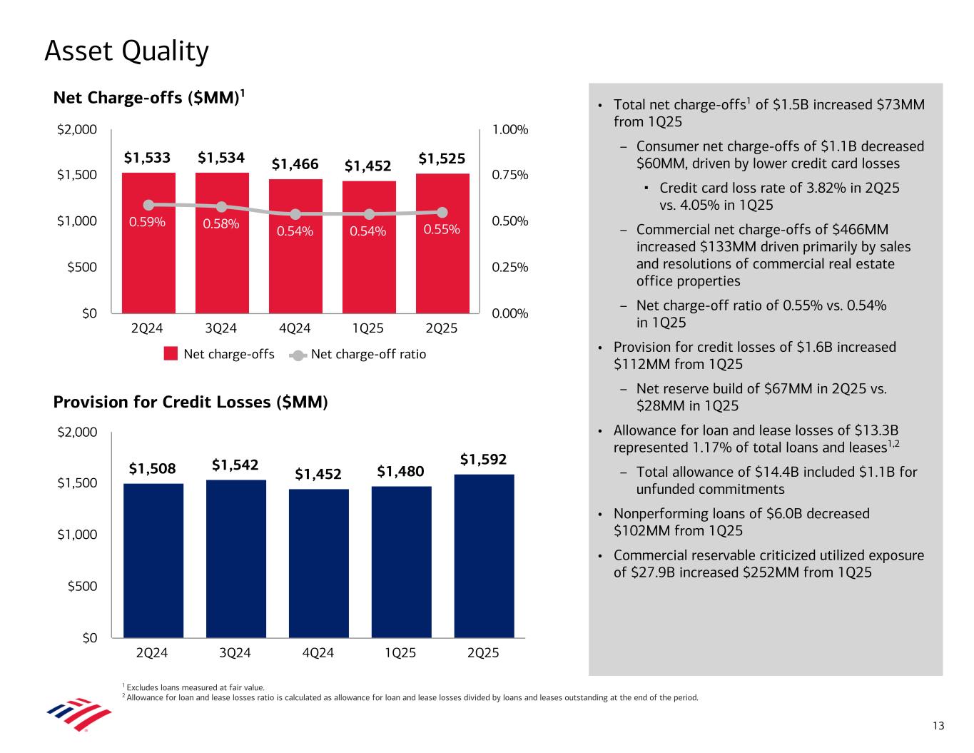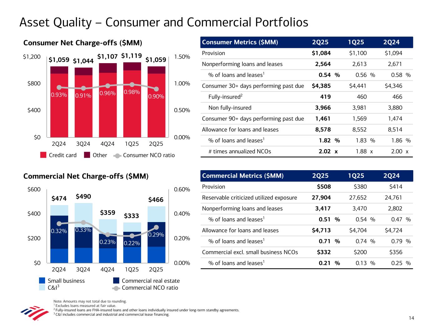 商业净销账($ MM)消费者净销账($ MM)资产质量–消费者和商业投资组合$ 474 $ 490 $ 359 $ 333 $ 466 0.32% 0.33% 0.23% 0.22% 0.29%小型企业商业房地产C & I商业NCO比率2Q24 3Q24 4Q24 1Q25 2Q25 $ 0 $ 200 $ 400 $ 600.00% 0.20% 0.40% 0.60% $ 1,059 $ 1,044 $ 1,107 $ 1,119 $ 1,0590.93% 0.91% 0.96% 0.98% 0.90%信用卡其他消费者NCO比率2Q24 3Q24 4Q24 1Q25 2Q25 $ 0 $ 400 $ 800 $ 1,200.00% 0.50% 1.00% 1.50%商业指标($ MM)2Q25 1Q25 2Q24 Provision $ 508 $ 380 $和租赁3,4173,4702,802%贷款和租赁1 0.51% 0.54% 0.47%贷款和租赁准备金4,713美元4,704美元4,724%贷款和租赁1 0.71% 0.74% 0.79%商业不包括小企业NCO 332美元200美元356%贷款和租赁1 0.21% 0.13% 0.25% Consumer Metrics($ mm)2Q25 1Q25 2Q24拨备1,084美元1,100美元1,094美元不良贷款和租赁2,5642,6132,671%贷款和租赁1 0.54% 0.56% 0.58%消费者30 +天履约逾期$ 4,385 $ 4,441 $ 4,346全额保险2419460466非全额保险3,9663,9813,880消费者90 +天履约逾期1,4611,5691,474贷款和租赁备抵8,5788,5528,514%贷款和租赁11.82% 1.83% 1.86% #乘以年化NCOS 2.02 x 1.88 x 2.00 x 143注:由于四舍五入,金额可能不合计。1不包括以公允价值计量的贷款。2全保贷款是FHA保险贷款和其他根据长期备用协议单独投保的贷款。3 C & I包括商业和工商业租赁融资。