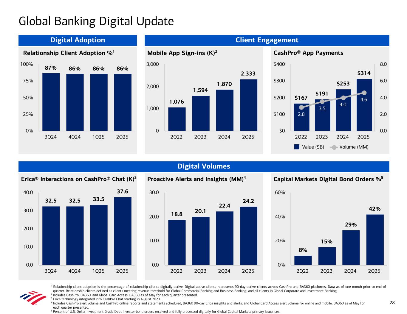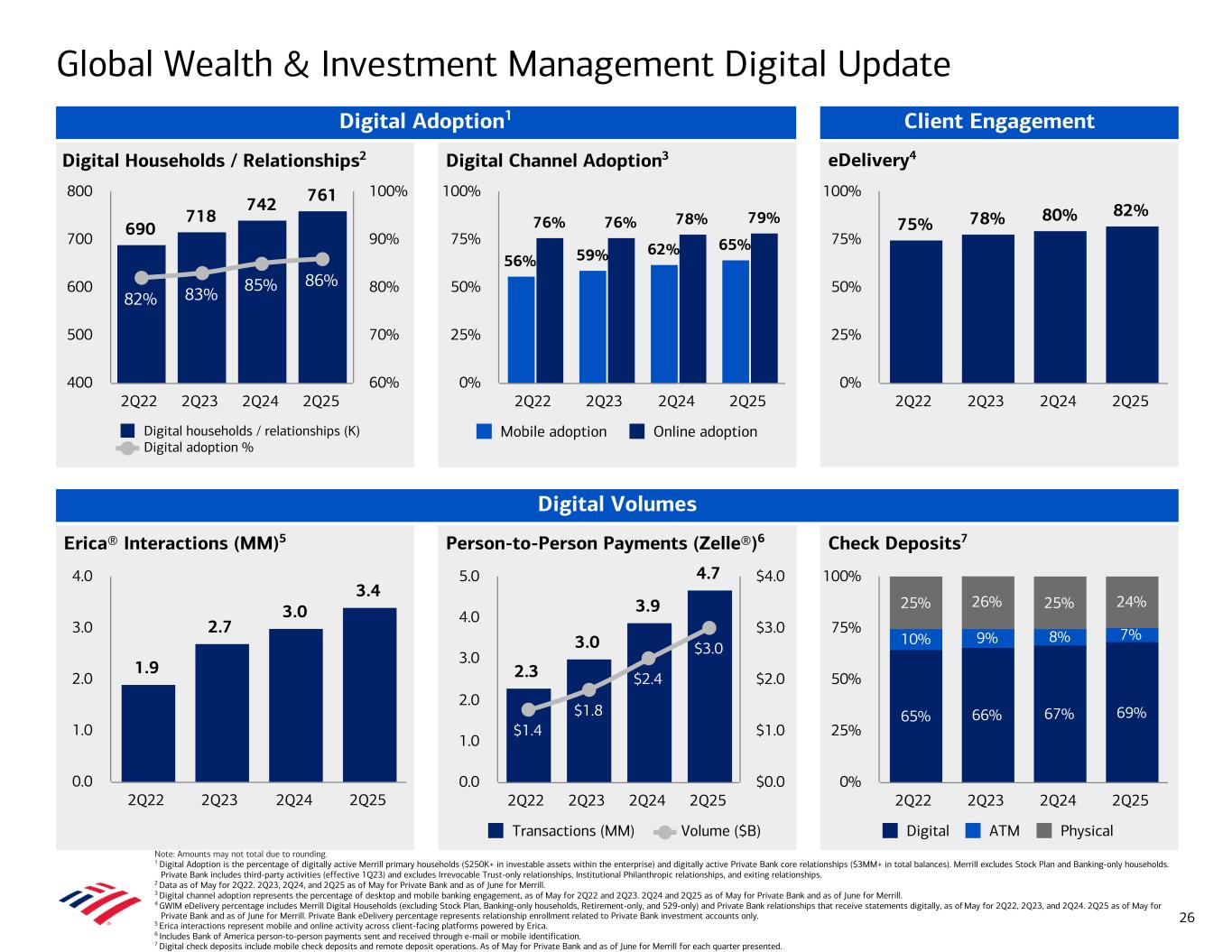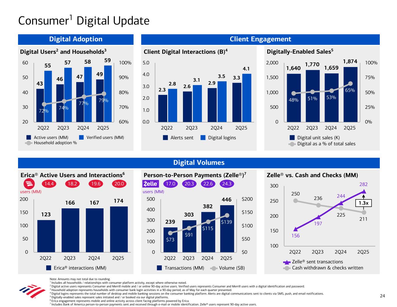 埃丽卡®活跃用户和互动6 Zelle®vs.现金和支票(MM)数字化销售5Digital Users2和Households3 Client Digital Interactions(B)41,6401,7701,6591,87448% 51% 53% 65% Digital Unit Sales(K)Digital占总销售额的百分比2Q22 2Q23 2Q24 2Q25 05001,0001,5001,5002,0000% 25% 50% 75% 100% 2.3 2.6 2.9 3.3 2.8 3.1 3.5 4.1警报已发送数字登录2Q22 2Q23 2Q24 2Q25 0.01.0 2.0 2.03.04.05.04 34647495557585972% 74% 77% 79%活跃用户(MM)验证用户(MM)家庭采用率% 2Q22 2Q23 2Q24 2Q25 203040506060% 70% 80% 90% 100%客户参与个人对个人付款(Zelle®)7数字卷239303382446 $ 73 $ 91 $ 115 $ 139交易(mm)卷($ B)2Q22 2Q23 2Q24 2Q250100200300400500 $ 0 $ 50 $ 100 $ 150 $ 200 Consumer1数字更新注:由于四舍五入,金额可能不总计。1包括与消费者平台活动有关的所有家庭/关系,除非另有说明。2数字活跃用户代表Consumer和Merrill移动和/或在线90天活跃用户。经过验证的用户以数字身份和密码代表Consumer和Merrill用户。3 Household adoption represents households with consumer bank login activities in a 90-day period,as of May for each quarter presented。4数字登录表示消费者银行平台上的桌面和移动银行会话总数。警报是通过短信、推送和电子邮件通知发送给客户的数字通信。5数字化销售代表通过我们的数字平台发起和/或预订的销售。6 Erica参与代表了由Erica提供支持的面向客户的平台上的移动和在线活动。7包括通过电子邮件或移动身份识别发送和接收的美国银行个人对个人付款。泽勒®用户代表90天活跃用户。17.02 0.32 2.62 4.3用户(mm)24数字采用123166167174 Erica®互动(mm)2Q22 2Q23 2Q24 2Q25 05010015020025023622521156197244282 Zelle®已发送交易现金提取&支票写入2Q22 2Q23 2Q24 2Q25 100150200250300 1.3x 14.4 18.2 19.62 0.0用户(mm)