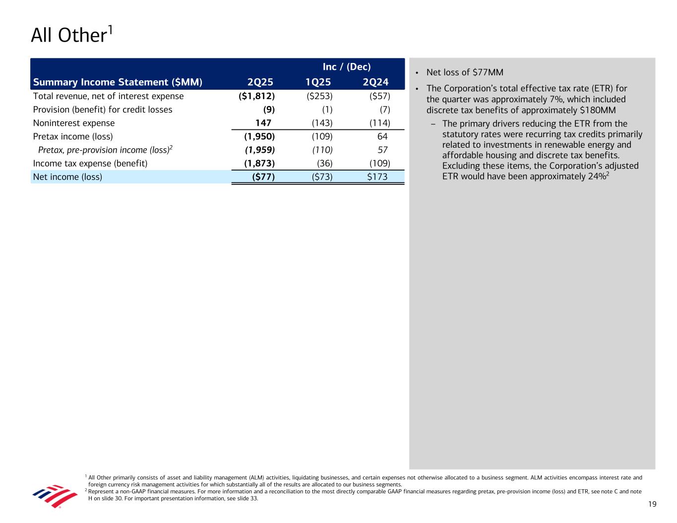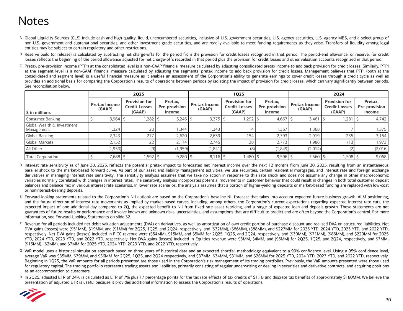 A全球流动性来源(GLS)包括现金和高质量、有流动性、未设押的证券,包括美国政府证券、美国机构证券、美国机构MBS以及一组精选的非美国政府和超国家证券,以及其他投资级证券,并且随时可以满足出现的资金需求。法律实体之间的流动性转移可能会受到某些监管和其他限制。B准备金建立(或释放)的计算方法是从该期间确认的信用损失准备金中减去该期间的净冲销。信用损失的期末备抵或准备金反映了根据该期间记录的净冲销调整的期初备抵加上该期间确认的信用损失准备金和其他估值账户。C税前,合并层面的拨备前收入(PTPI)是一种非公认会计准则财务指标,通过调整合并税前收入以加回信用损失拨备计算得出。同样,分部层面的PTPI是一种非公认会计准则财务指标,通过调整分部的税前收入以加回信用损失拨备计算得出。管理层认为,PTPI(在合并层面和分部层面)是一种有用的财务衡量标准,因为它能够评估公司在一个信贷周期中产生收益以弥补信贷损失的能力,并通过隔离信贷损失准备金的影响为比较公司在不同期间的经营业绩提供额外的基础,而信贷损失准备金在不同期间可能有很大差异。见下文对账。D截至2025年6月30日的利率敏感性,反映了对基于市场的远期曲线的瞬时平行冲击对自2025年6月30日起的未来12个月的预测净利息收入的潜在税前影响。作为我们资产和负债管理活动的一部分,我们使用证券、某些住宅抵押贷款以及利率和外汇衍生品来管理利率敏感性。敏感性分析假设我们没有针对这一利率冲击采取任何行动,也没有假设通常与利率变化相关的其他宏观经济变量发生任何变化。敏感性分析纳入了客户行为的潜在变动,这些变动可能导致客户存款总余额和不同利率情景下的余额组合发生变化。在较低的利率情景下,分析假设一部分较高收益的存款或市场化融资被低成本或无息存款所取代。E与公司NII前景相关的前瞻性陈述基于公司的基线NII预测,该预测考虑了预期的未来业务增长、ALM定位以及基于市场的曲线所暗示的利率变动的未来方向,其中包括公司目前对预期降息的预期、与第二季度相比增加一天的预期影响、固定利率资产重新定价对NII的预期益处以及一系列预期的贷款和存款增长。这些陈述不是对未来结果或业绩的保证,涉及已知和未知的风险、不确定性和难以预测且通常超出公司控制范围的假设。欲了解更多信息,请参阅幻灯片32上的前瞻性陈述。F所有期间的收入都包括衍生品的净借方估值调整(DVA),以及购买折扣的自有贷方部分的摊销和结构性负债的实现DVA。2Q25、1Q25、2Q24的净DVA收益(亏损)分别为($ 51mm)、$ 19mm、($ 1mm),2025 YTD、2024 YTD、2023 YTD、2022 YTD分别为($ 32mm)、($ 86mm)、($ 88mm)、$ 227mm。FICC收入中包含的净DVA收益(损失)在2Q25、1Q25和2Q24分别为($ 54mm)、$ 15mm和$ 5mm,在2025年年初至今、2024年年初至今、2023年年初至今和2022年年初至今分别为($ 39mm)、($ 71mm)、($ 86mm)和$ 220mm。2Q25、1Q25和2Q24计入股票收入的净DVA收益(损失)分别为300万美元、400万美元和(600万美元),2025年初至今、2024年初至今、2023年初至今和2022年初至今分别为700万美元、(1500万美元)、(200万美元)和700万美元。G VaR模型使用了基于三年历史数据的历史模拟方法和相当于99%置信水平的预期短缺方法。使用95%的置信水平,2Q25、1Q25和2Q24的平均VaR分别为$ 35mm、$ 39mm和$ 36mm,2025年初至今、2024年初至今、2023年初至今和2022年初至今的平均VaR分别为$ 37mm、$ 34mm、$ 31mm和$ 26mm。从25年第一季度开始,列报的所有期间的VaR金额是公司对其交易组合进行风险管理时使用的金额。此前, 列报的VaR金额是用于监管资本的金额。交易组合代表交易资产和负债,主要包括定期承销或交易证券和衍生品合约,以及作为向客户提供便利的获取头寸。H在2Q25,24%的调整后ETR计算为7%的ETR加上17个百分点的税收抵免$ 1.1B的税率影响和约$ 180mm的离散税收优惠。我们认为调整后的ETR的列报方式是有用的,因为它提供了额外的信息来评估公司的经营业绩。票据百万美元2Q25 1Q25 2Q24税前收入(GAAP)信贷损失准备金(GAAP)税前、拨备前收入税前收入(GAAP)信贷损失准备金(GAAP)税前、拨备前收入税前收入(GAAP)信贷损失准备金(GAAP)税前,拨备前收入消费者银行业务3,964美元1,282美元5,246美元3,375美元1,292美元4,667美元3,461美元1,281美元4,742美元全球财富与投资管理1,324201,3441,343141,3571,36871,375全球银行业务2,3432772,6202,6391542,7932,9192353,154全球市场2,152222,1742,745282,7731,986(13)1,973所有其他(1,950)(9)(1,959)(1,841)(8)(1,849)(2,014)(2)(2,016)Total Corporation $ 7,688 $ 1,592 $ 9,280 $ 8,116