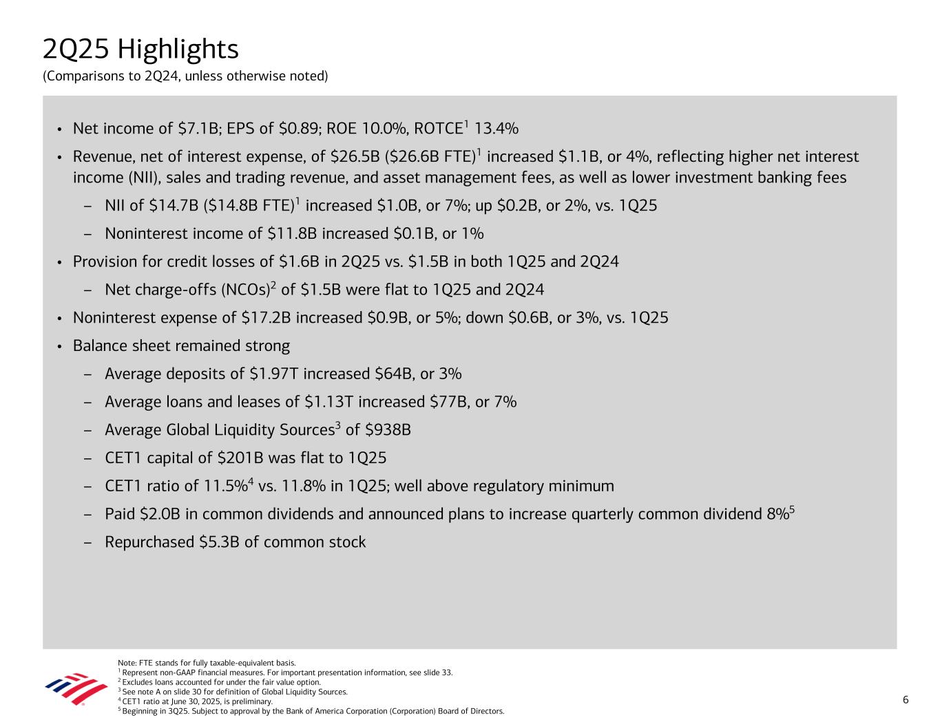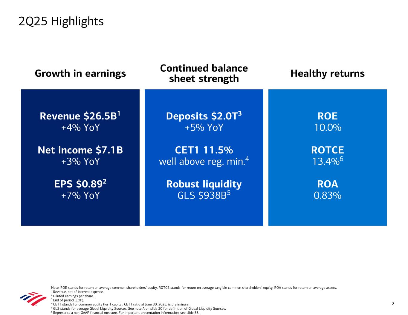 注:FTE代表完全应税等值基础。1代表非GAAP财务指标。有关重要的演示信息,请参见幻灯片33。2不包括根据公允价值选择权入账的贷款。3关于全球流动性来源的定义,见幻灯片30的注A。4截至2025年6月30日的CET1比率是初步的。5从25年第三季度开始。须经美国银行股份有限公司(Bank of America Corporation)董事会批准。2Q25亮点(与2Q24的比较,除非另有说明)•净收入$ 7.1b;EPS $ 0.89;ROE10.0 %,ROTCE1 13.4% •扣除利息费用后的收入$ 26.5b($ 26.6b FTE)1增加$ 1.1b,或4%,反映出净利息收入(NII)、销售和交易收入以及资产管理费增加,以及投资银行费用减少– NII $ 14.7b($ 14.8b FTE)1增加$ 1.0b,或7%;与2Q25相比增加$ 0.2B,或2% –非利息收入$ 11.8b增加$ 0.1b,或1% • 2Q25信贷损失准备金为$ 1.6B,而1Q25和2Q24均为$ 1.5B –净冲销(NCO)2为$ 1.5B,与1Q25和2Q24持平•非利息费用为$ 17.2B,增加$ 0.9B,或5%;与1Q25相比下降$ 0.6B,或3% •资产负债表保持强劲–平均存款为$ 1.97T,增加了$ 64B,或3% –平均贷款和租赁为$ 1.13T,增加了$ 77B,或7% –平均全球流动性来源3 $ 938B – CET1资本$ 201B与1Q25持平– CET1比率为11.5% 4,而1Q25为11.8%;远高于监管最低要求–支付$ 2.0B的普通股息并宣布计划增加季度普通股息8% 5 –回购$ 5.3B的普通股6