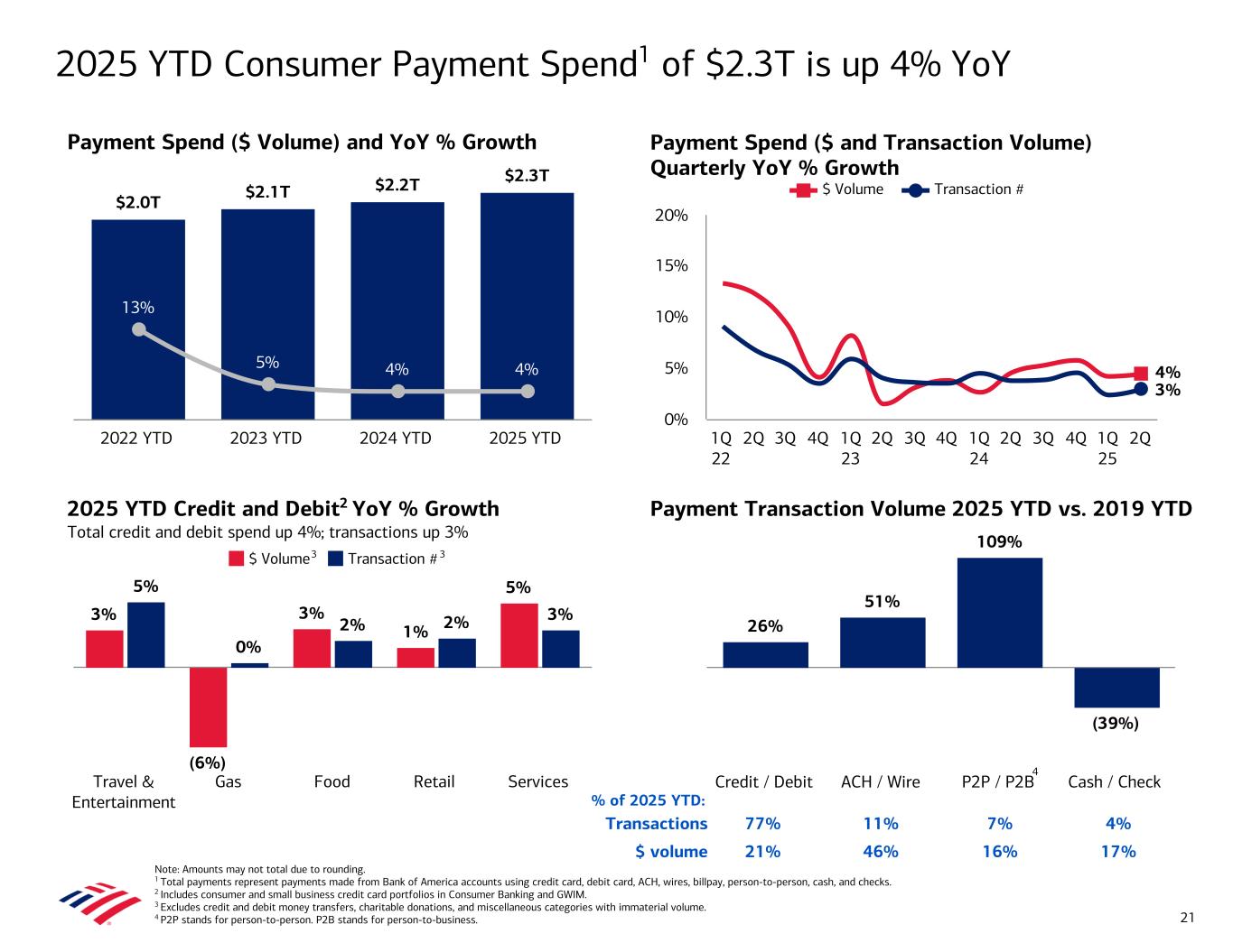 2025年年初至今消费者支付支出1为2.3T美元,同比增长4%支付支出(美元和交易量)季度同比%增长212025年年初至今信用和借方2同比%增长总信用和借方支出增长4%;交易量增长3% $交易量# 1Q 22 2Q Q3 4Q 1Q 23 2Q Q3 4Q 1Q 24 2Q Q3 4Q 1Q 25 2Q 0% 5% 10% 15% 20% 3%(6%)3% 1% 5% 5% 0% 2% 2% 2% 3% $交易量#旅游和娱乐燃气食品零售服务支付支出(美元交易量)和同比%增长$ 2.0T $ 2.1T $ 2.2T $ 2.3T 13% 5% 4% 4% 2022 YTD 2023 YTD 2024 YTD 2025 YTD 4% 3%支付交易量2025年年初至今与2019年年初至今26% 51% 109%(39%)2025年年初至今的贷记/借记ACH/Wire P2P/P2B Cash/Check %:交易77% 11% 7% 4% $交易量21% 46% 16% 17% 4注:由于四舍五入,金额可能不合计。1支付总额表示使用信用卡、借记卡、ACH、电汇、账单支付、个人对个人、现金和支票从美国银行账户进行的支付。2包括消费者银行和GWIM中的消费者和小企业信用卡组合。3不包括贷记款和借记款转账、慈善捐赠和非实质性数量的杂项类别。4 P2P代表个人对个人。p2B代表个人对企业。3 3